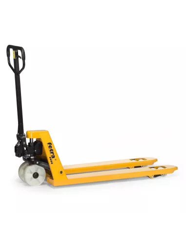 Châssis et fourches en tôle d'acier, revêtement époxy jaune. Pompe hydraulique manuelle sans entretien. Poignée habillée de caoutchouc pour: lever - rouler - descendre. Rotation: 2 x 100°. Galets en tête de fourches. Résistance au roulement faible, ainsi qu'aux produits chimiques. Indiqués sur sols plats et lisses. Roulement bruyant.