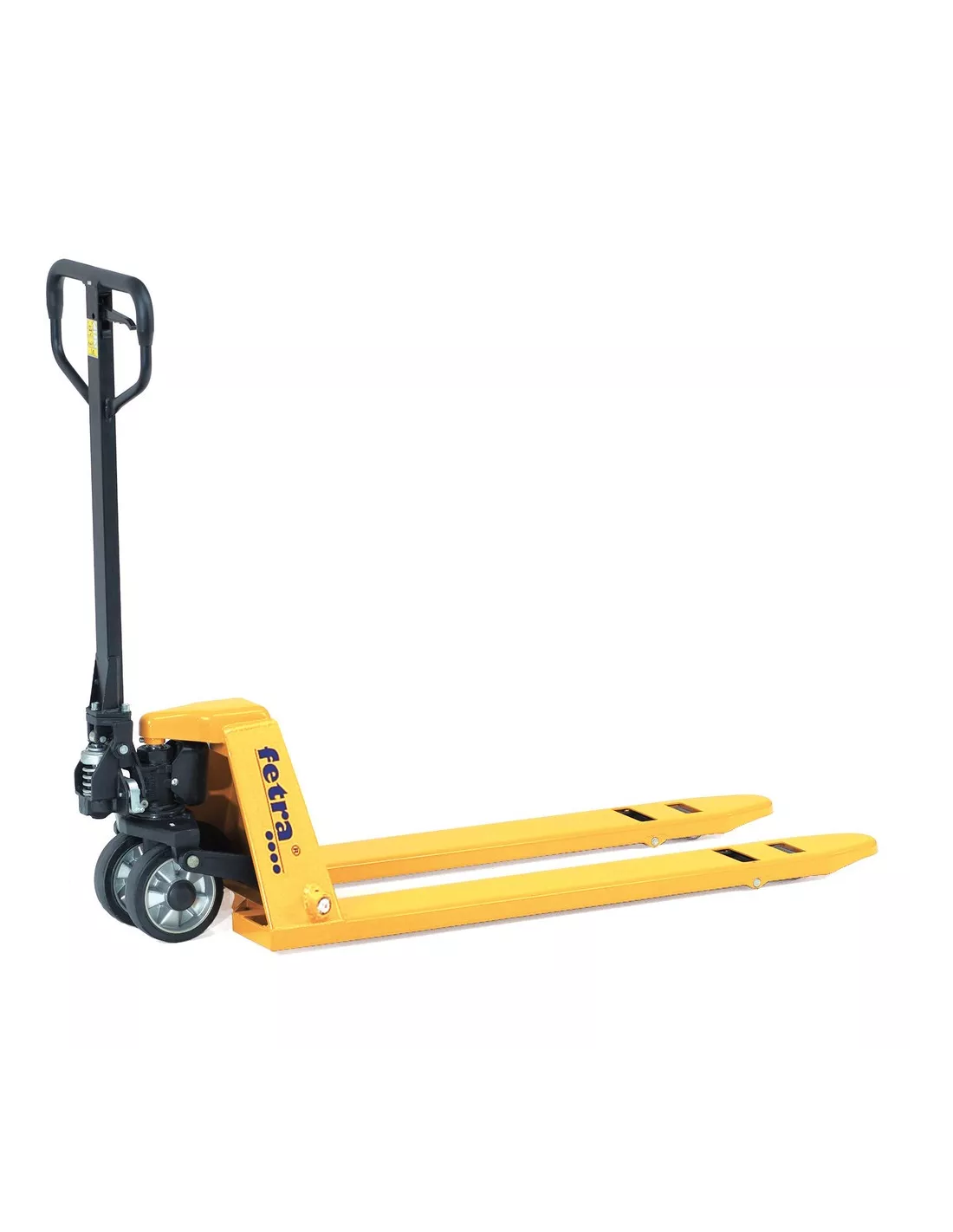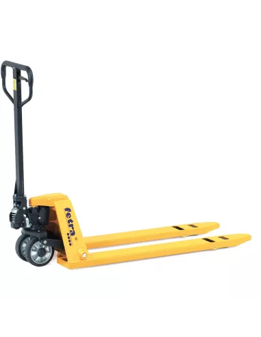 Châssis et fourches en tôle d'acier, revêtement époxy jaune. Pompe hydraulique manuelle, sans entretien. Poignée habillée de caoutchouc pour: lever - rouler - descendre. Modèle abaissé d'une hauteur de 55 mm levée 55 - 175 mm, pour charge à partir de 57 mm du sol. Roues directrices à bandage caoutchouc Ø 180 x 50 mm, boggies en nylon Ø 51 x 70 mm.