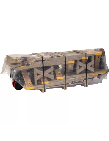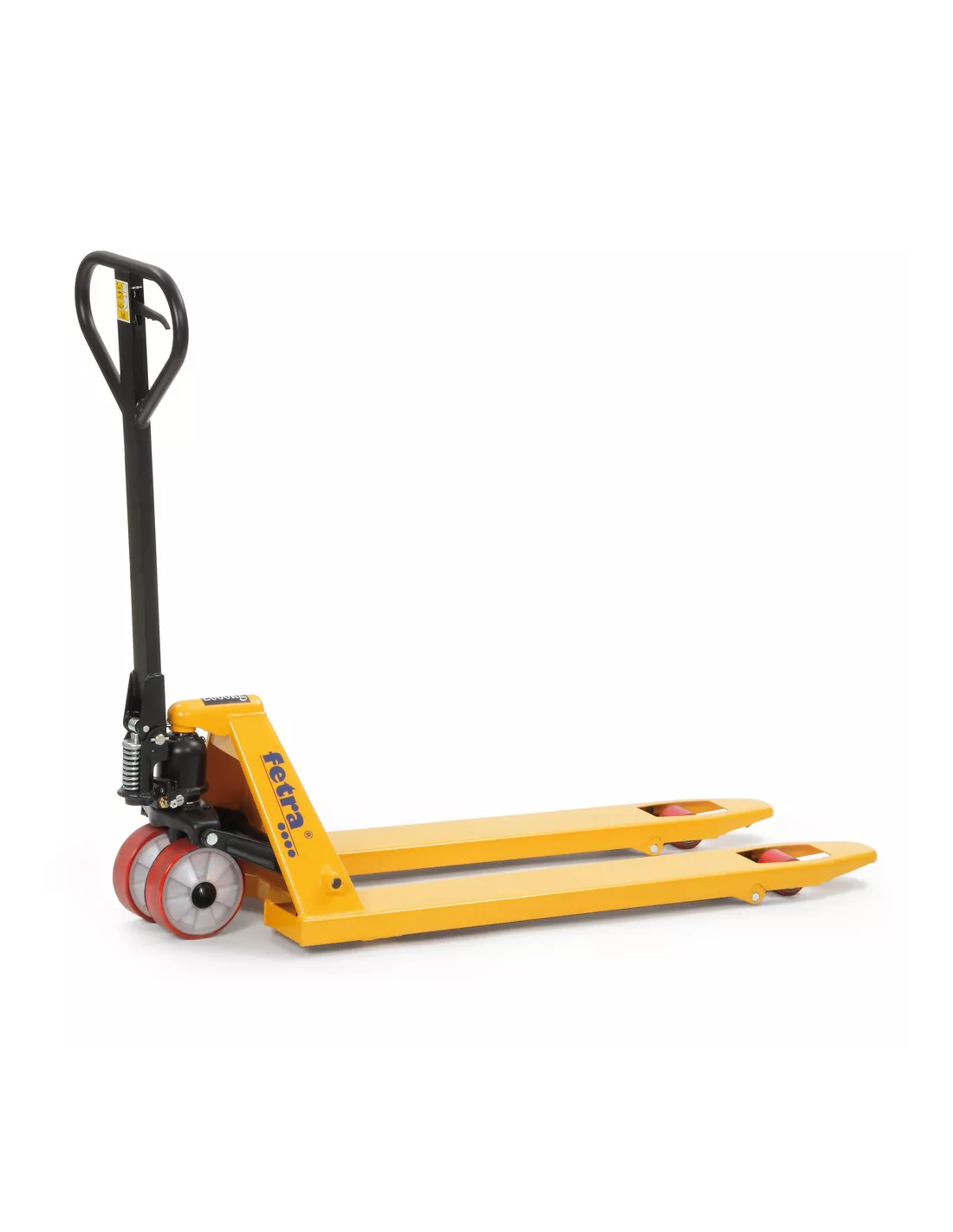 Les transpalettes sont livrés par 6 sur une palette. Le montage est facile à réaliser soi-même. Pour cela, il faut fixer le timon au cadre avec 3 vis et accrocher la chaîne au levier de renvoi. Version haut de gamme pour une utilisation professionnelle intensive, robuste et durable. Châssis et fourches en construction monocoque indéformable, avec graisseurs aux points de pivot et bielles réglables, finition époxy jaune de sécurité RAL 1003. Galets d’entrée et de sortie en tête de fourches. Unité hydraulique révisable avec piston chromé et réservoir d’huile externe, palier sans entretien. Timon ergonomique en tube d’acier avec palier de renvoi pour la poussée, finition noire époxy, poignée gaînée de caoutchouc. Commande à une main, facilement dosable, pour: Lever – Rouler – Descendre. Angle de braquage : 2 x 100 °. Résistance au roulement modérée, non traçantes. Garantie 2 ans