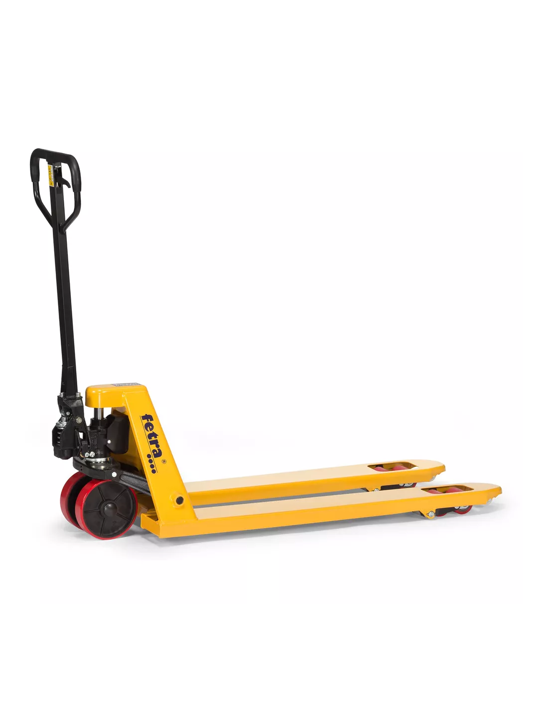 Les transpalettes sont livrés par 6 sur une palette. Le montage est facile à réaliser soi-même. Pour cela, il faut fixer le timon au cadre avec 3 vis et accrocher la chaîne au levier de renvoi. Version haut de gamme pour une utilisation professionnelle intensive, robuste et durable. Châssis et fourches en construction monocoque indéformable, avec graisseurs aux points de pivot et bielles réglables, finition époxy jaune de sécurité RAL 1003. Galets d’entrée et de sortie en tête de fourches. Unité hydraulique révisable avec piston chromé et réservoir d’huile externe, palier sans entretien. Timon ergonomique en tube d’acier avec palier de renvoi pour la poussée, finition noire époxy, poignée gaînée de caoutchouc. Commande à une main, facilement dosable, pour: Lever - Rouler - Descendre. Angle de braquage : 2 x 100 °. Résistance au roulement faible, roulement amorti. Indiqués sur sols difficiles, non traçantes. Roulement noon bruyant. Garantie 2 ans