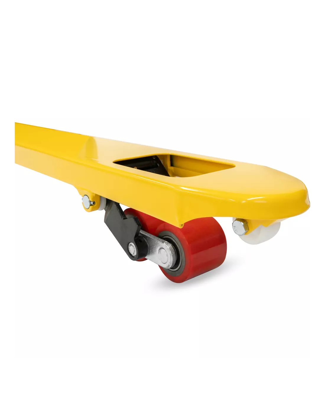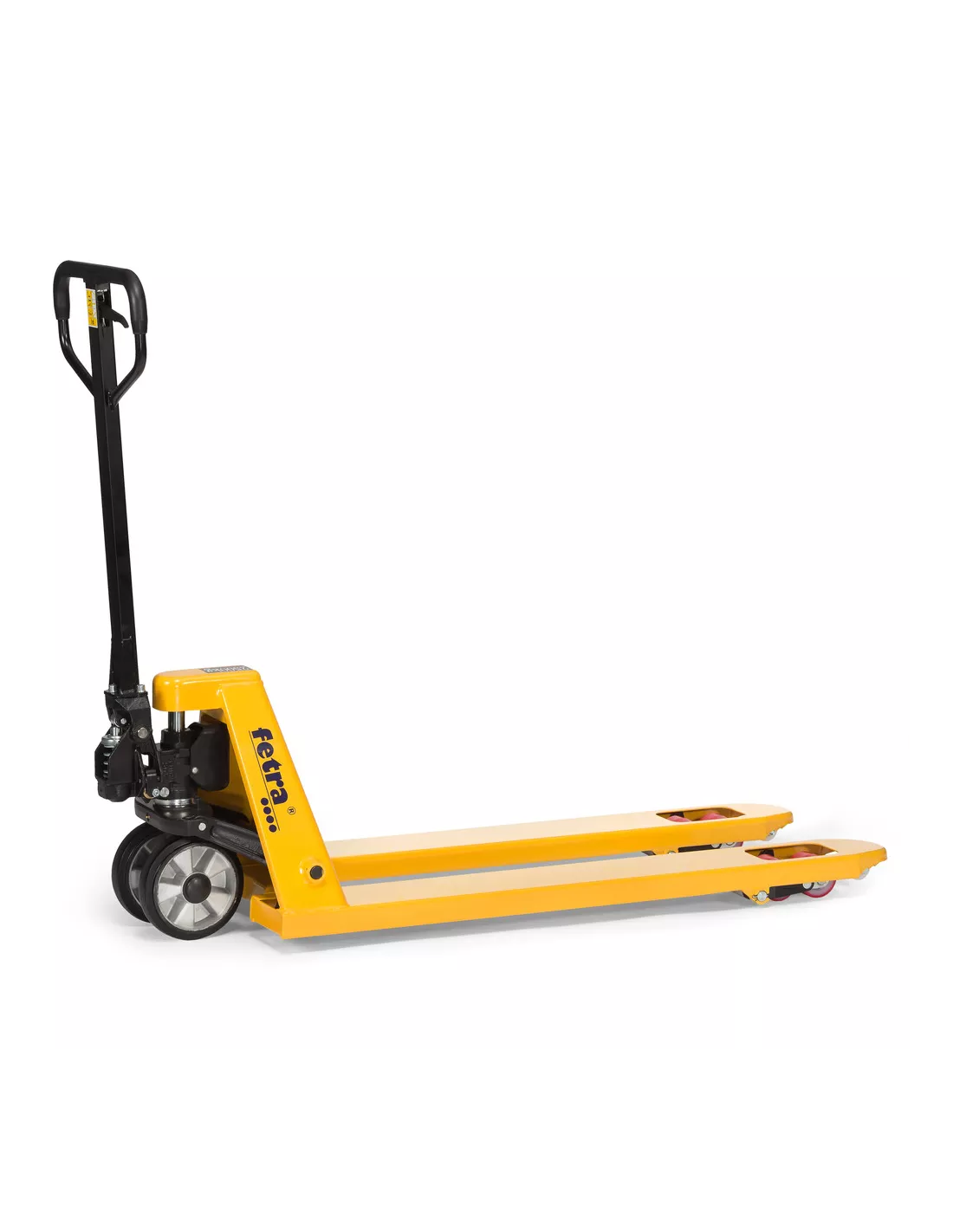 Les transpalettes sont livrés par 6 sur une palette. Le montage est facile à réaliser soi-même. Pour cela, il faut fixer le timon au cadre avec 3 vis et accrocher la chaîne au levier de renvoi. Version haut de gamme pour une utilisation professionnelle intensive, robuste et durable. Châssis et fourches en construction monocoque indéformable, avec graisseurs aux points de pivot et bielles réglables, finition époxy jaune de sécurité RAL 1003. Galets d’entrée et de sortie en tête de fourches. Unité hydraulique révisable avec piston chromé et réservoir d’huile externe, palier sans entretien. Timon ergonomique en tube d’acier avec palier de renvoi pour la poussée, finition noire époxy, poignée gaînée de caoutchouc. Commande à une main, facilement dosable, pour: Lever - Rouler - Descendre. Angle de braquage : 2 x 100 °. Résistance au roulement modéré. Indiqués sur sols difficiles et accidentés, avantageux pour le franchissement fréquent de marches et rebords. Roulement non bruyant. Garantie 2 ans