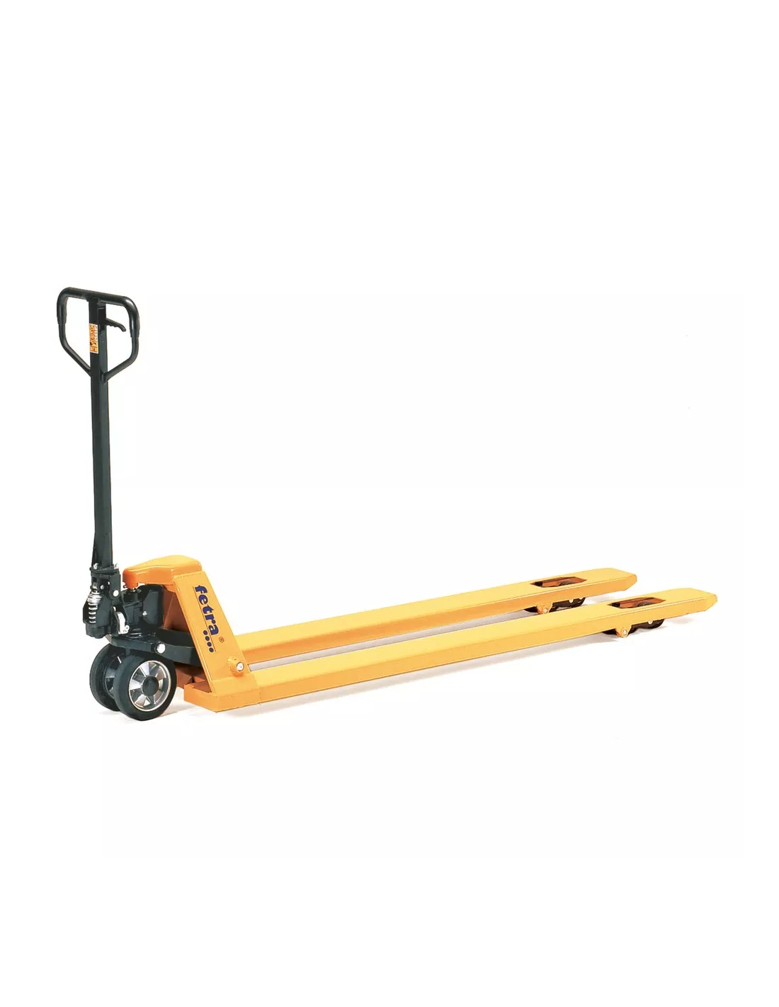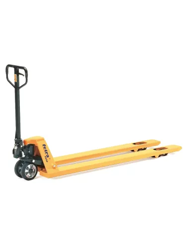 Châssis et fourches en tôle d'acier, revêtement époxy jaune. Pompe hydraulique manuelle, sans entretien. Poignée habillée de caoutchouc pour: lever - rouler - descendre. Modèles rallongés, longueur fourches 1800 mm. Roues directrices à bandage caoutchouc Ø 200 x 50 mm, boggie en nylon Ø 80 x 70 mm. Charge réduite..