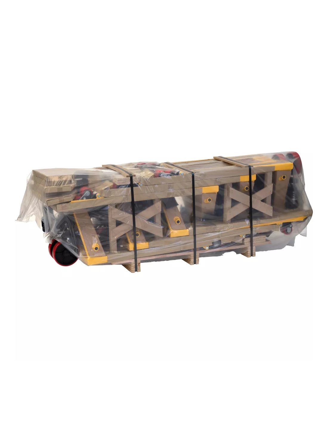 Les transpalettes sont livrés par 6 sur une palette. Le montage est facile à réaliser soi-même. Pour cela, il faut fixer le timon au cadre avec 3 vis et accrocher la chaîne au levier de renvoi. Châssis et fourches en tôle d'acier, revêtement époxy jaune. Pompe hydraulique manuelle, sans entretien. Poignée habillée de caoutchouc pour: lever - rouler - descendre. Modèle à fourches courtes de 800 mm. Recommandé pour camion ou locaux étroits.
