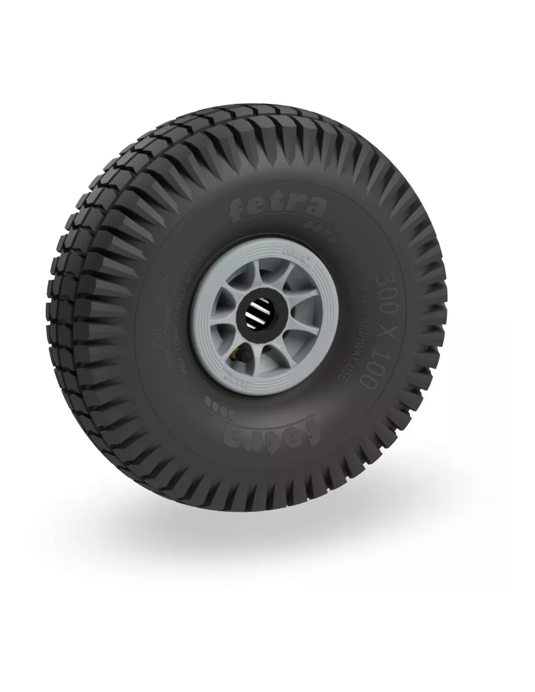 Roue gonflable montée sur jante en polyamide gris renforcée en fibres de verre, moyeu à roulement à rouleaux.