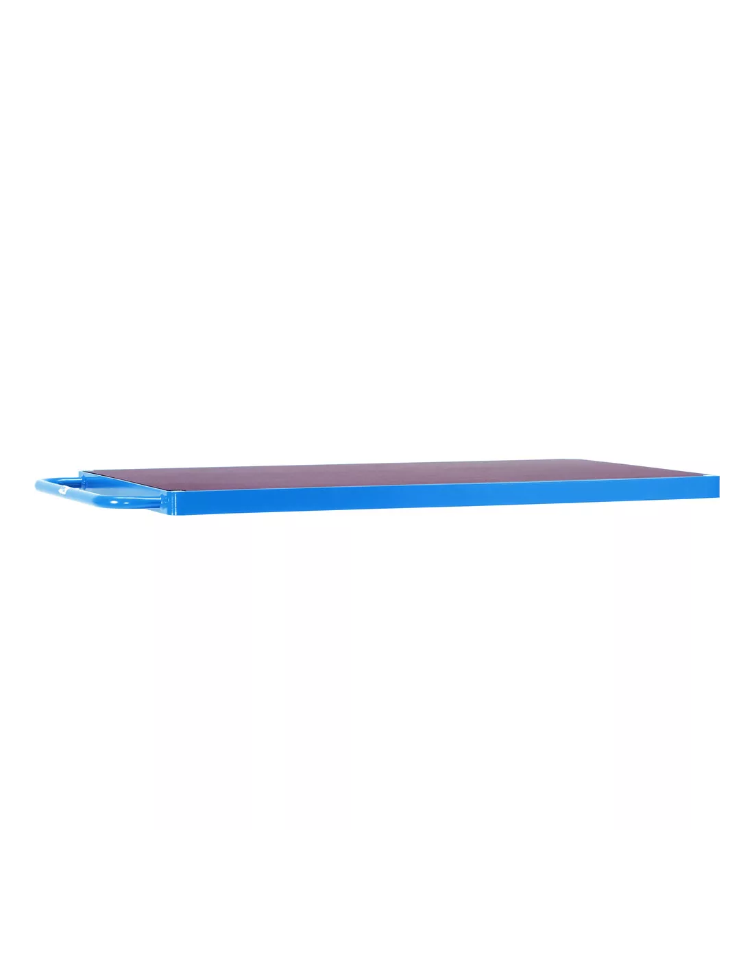 Plateforme de table avec poignée du système modulaire SuperMultiVario, revêtement époxy bleu RAL 5007. Plateau en aggloméré antidérapant, plastifié et hydrofuge. Les éléments du système sont simplement insérés et vissés.