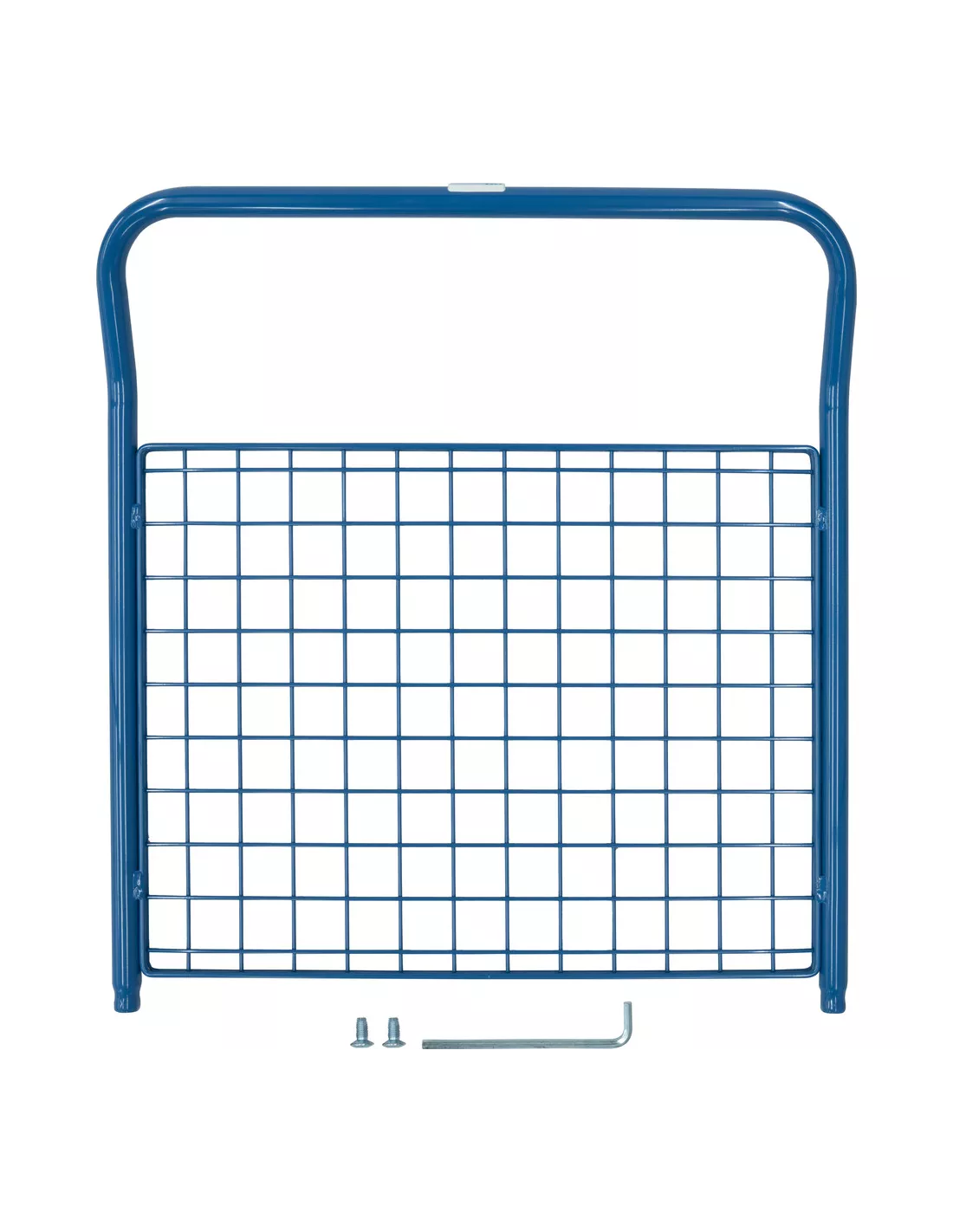 Ensemble mécano-soudé, revêtement époxy bleu RAL 5007. Ridelle en treillis métallique 50 x 50 x 4 mm, hauteur 500 mm.