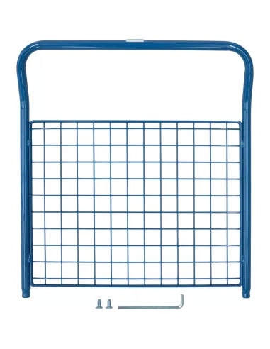 Ensemble mécano-soudé, revêtement époxy bleu RAL 5007. Ridelle en treillis métallique 50 x 50 x 4 mm, hauteur 500 mm.