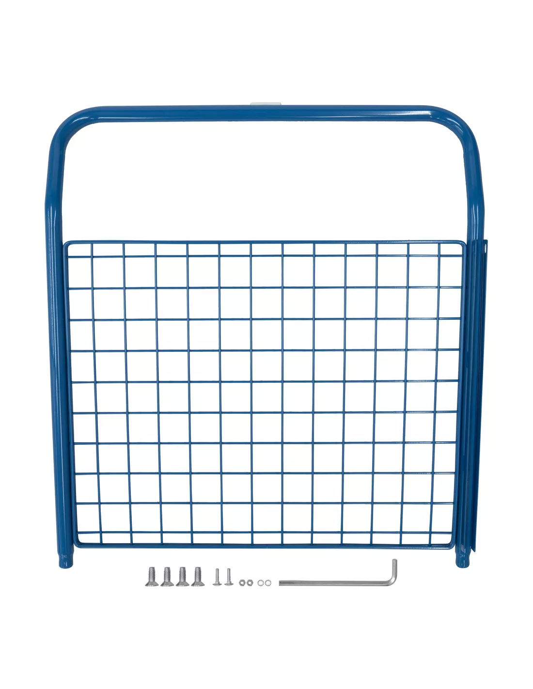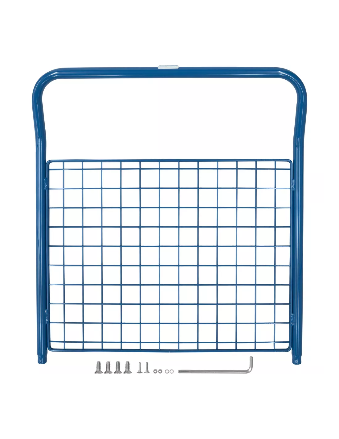 Ensemble mécano-soudé, revêtement époxy bleu RAL 5007. Ridelle en treillis métallique 50 x 50 x 4 mm, hauteur 500 mm. La grand côté est insérée sur le côté droit.