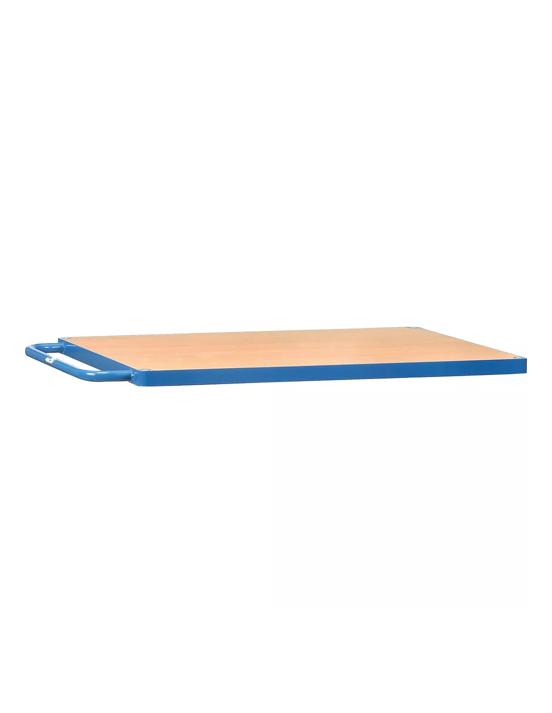 Plateforme de table avec poignée du système modulaire MultiVario, revêtement époxy bleu RAL 5007. Plateau en mélaminé surface effet hêtre. Les éléments du système sont simplement insérés et vissés.