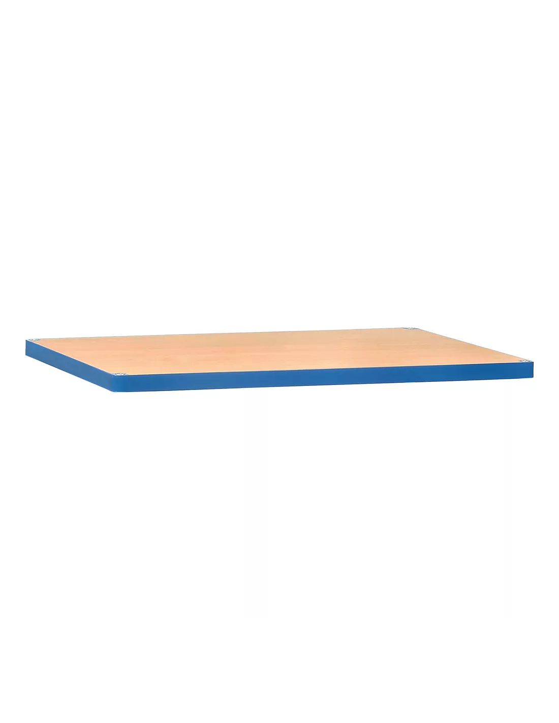 Plateforme de table sans poignée du système modulaire MultiVario, revêtement époxy bleu RAL 5007. Plateau en mélaminé surface effet hêtre. Les éléments du système sont simplement insérés et vissés.