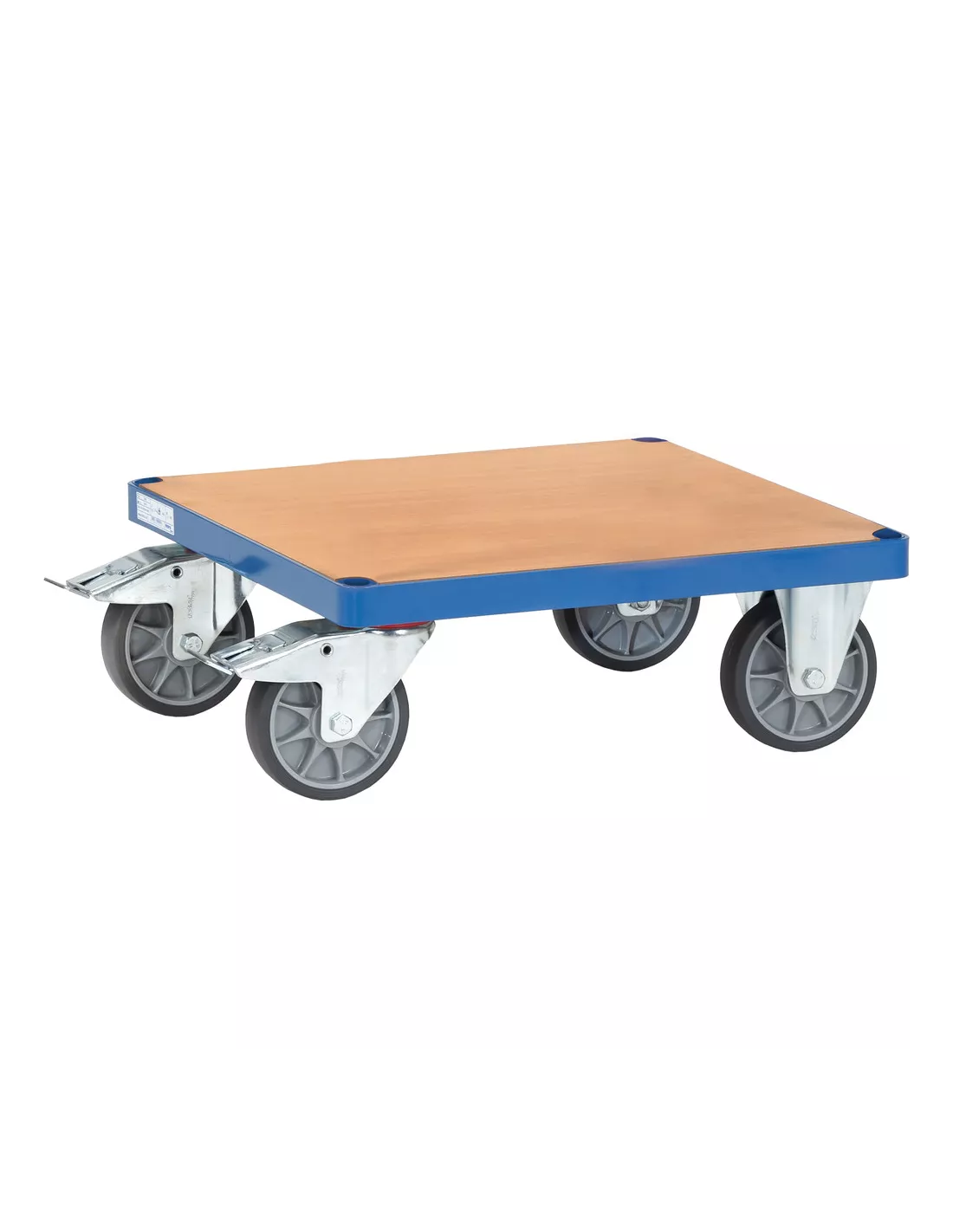 Châssis du système modulaire MultiVario, revêtement époxy bleu RAL 5007. Plateau en mélaminé surface effet hêtre. Les éléments du système sont simplement insérés et vissés.