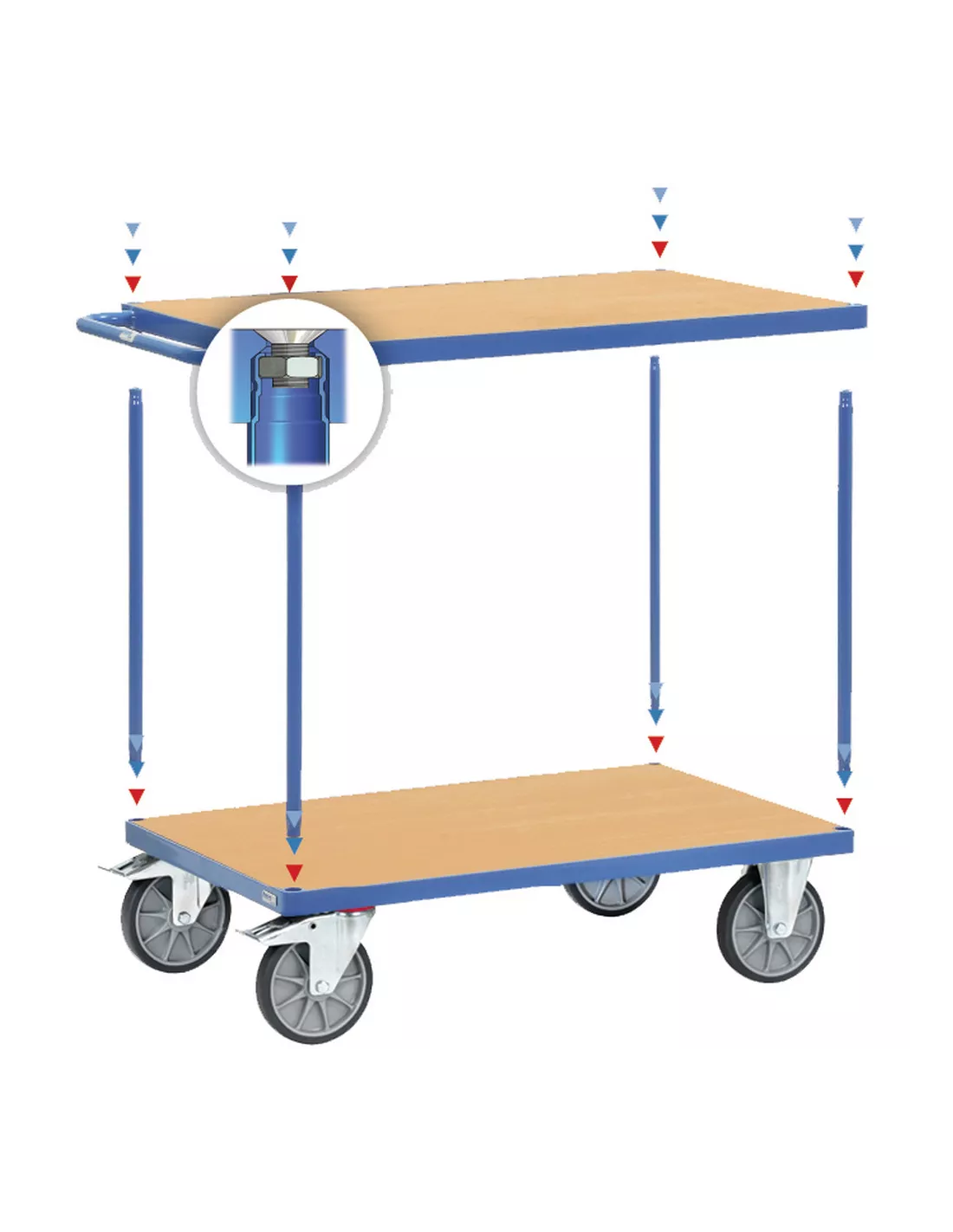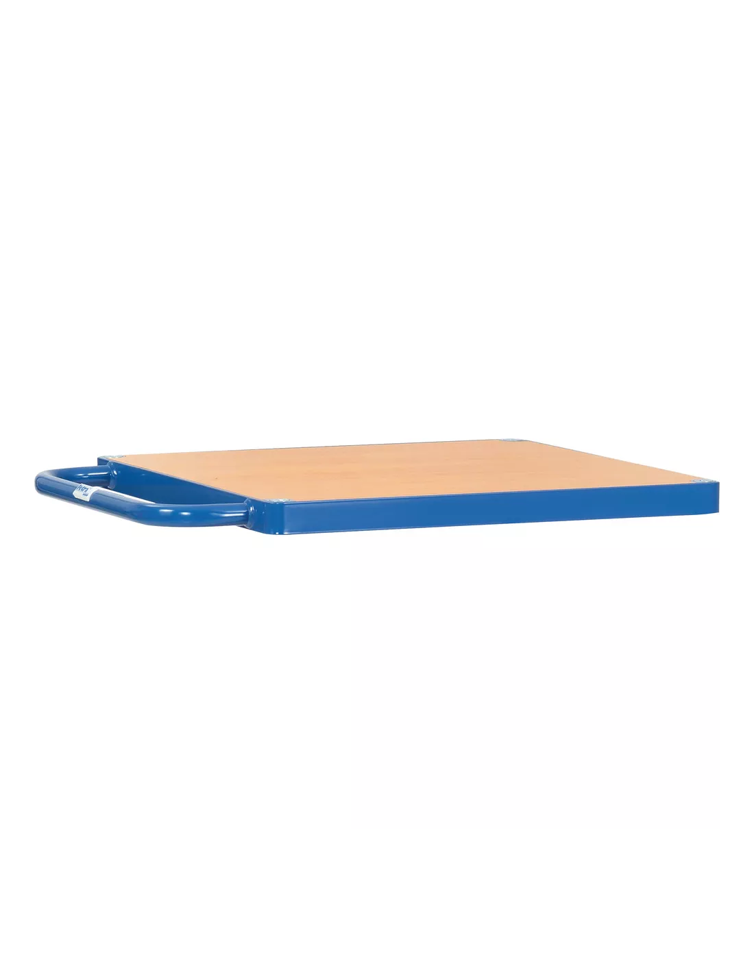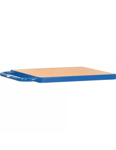 Plateforme de table du système modulaire MultiVario, revêtement époxy bleu RAL 5007. Plateau en mélaminé surface effet hêtre. Les éléments du système sont simplement insérés et vissés.