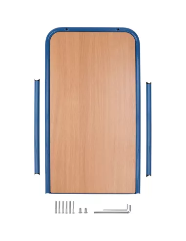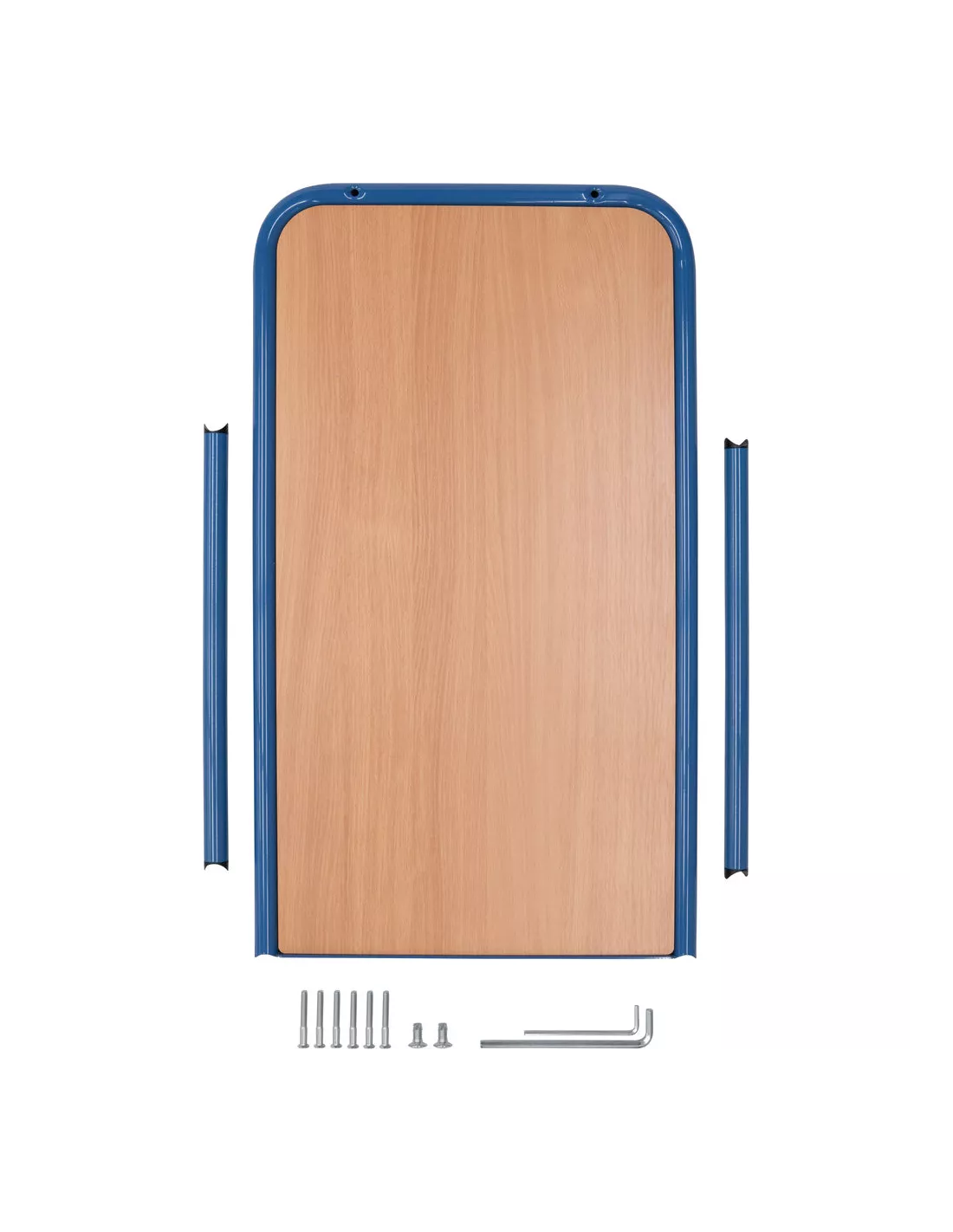 Plateforme pour servantes légers, revêtement époxy bleu RAL 5007. Plateau en mélaminé surface effet hêtre. Les éléments du système sont simplement insérés et vissés.