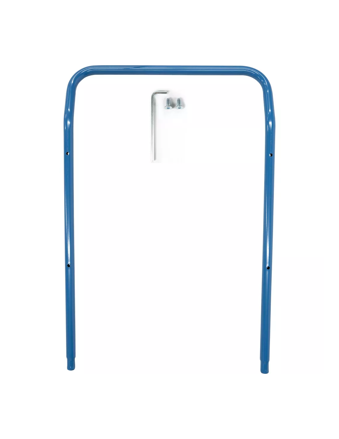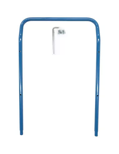 Barre vertical pour poussée de servantes légers. En tube d'acier cintré, revêtement époxy bleu RAL 5007. Incl. matériel de montage sur côté des roulettes pivotantes des chariots.