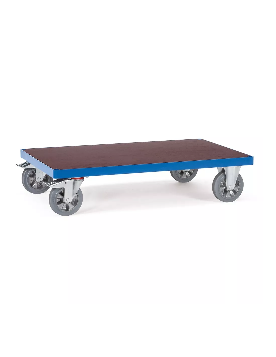 Ensemble mécano-soudé, revêtement époxy bleu RAL 5007. Plateforme en aggloméré antidérapant, plastifié et hydrofuge. Chariot spécialement conçu pour transporter des charges lourdes, les roues à bandage élastique sur jantes en aluminium avec moyeu à roulement à billes permettent un déplacement aisé et confortable. 2 roues fixes et 2 roues pivotantes à bandage caoutchouc élastique, bleu-gris non traçant. Freins sur roues pivotantes.