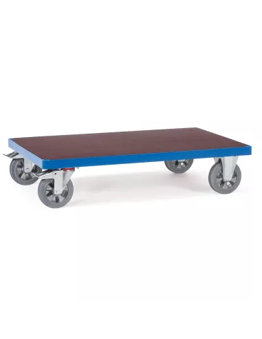 Ensemble mécano-soudé, revêtement époxy bleu RAL 5007. Plateforme en aggloméré antidérapant, plastifié et hydrofuge. Chariot spécialement conçu pour transporter des charges lourdes, les roues à bandage élastique sur jantes en aluminium avec moyeu à roulement à billes permettent un déplacement aisé et confortable. 2 roues fixes et 2 roues pivotantes à bandage caoutchouc élastique, bleu-gris non traçant. Freins sur roues pivotantes.