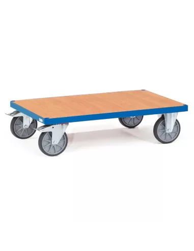 Système modulable. Ensemble mécano-soudé, revêtement époxy bleu RAL 5007, plateau surface effet hêtre, 2 roues pivotantes et 2 roues fixes à bandage TPE, moyeu à roulement à billes central. Freins sur roues pivotantes.