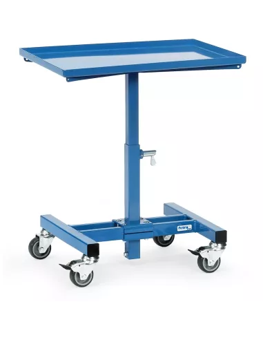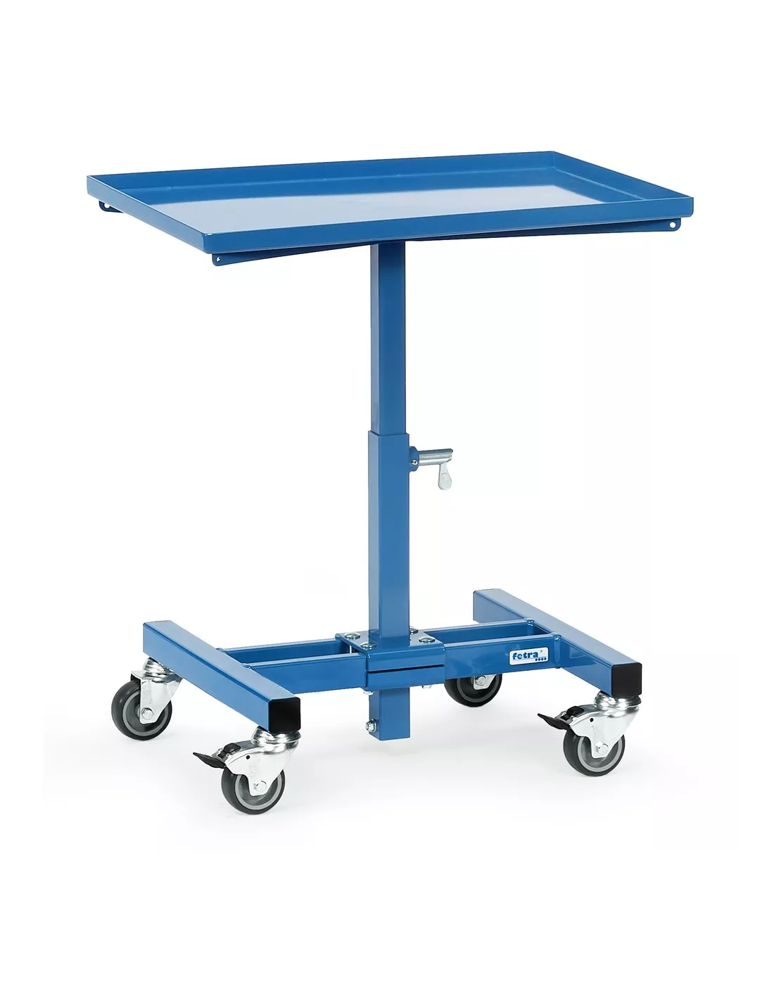Pour bacs en plastique, bacs en tôle d'acier, corbeilles en fil métallique, etc., réglable en hauteur et mobile. Construction en profilé et tube d'acier avec plateau en tôle avec rebord de 20 mm. Non inclinable. Hauteur réglable au pas de 25 mm. Revêtement époxy bleu RAL 5007. 4 roues pivotantes à bandage TPE, roulement à palier lisse. 2 roues avec freins.