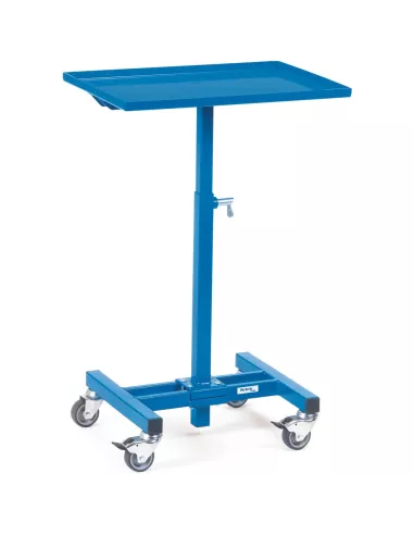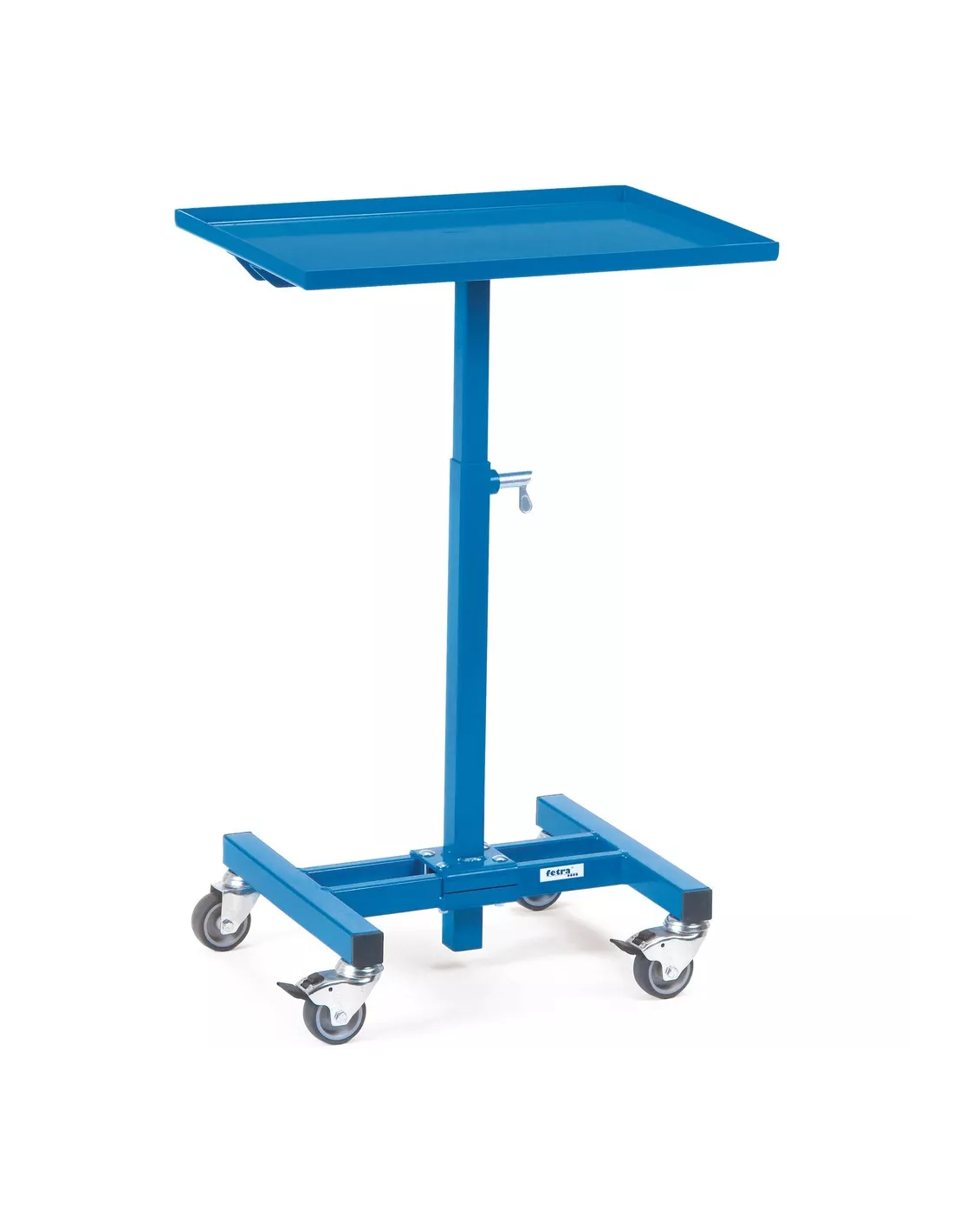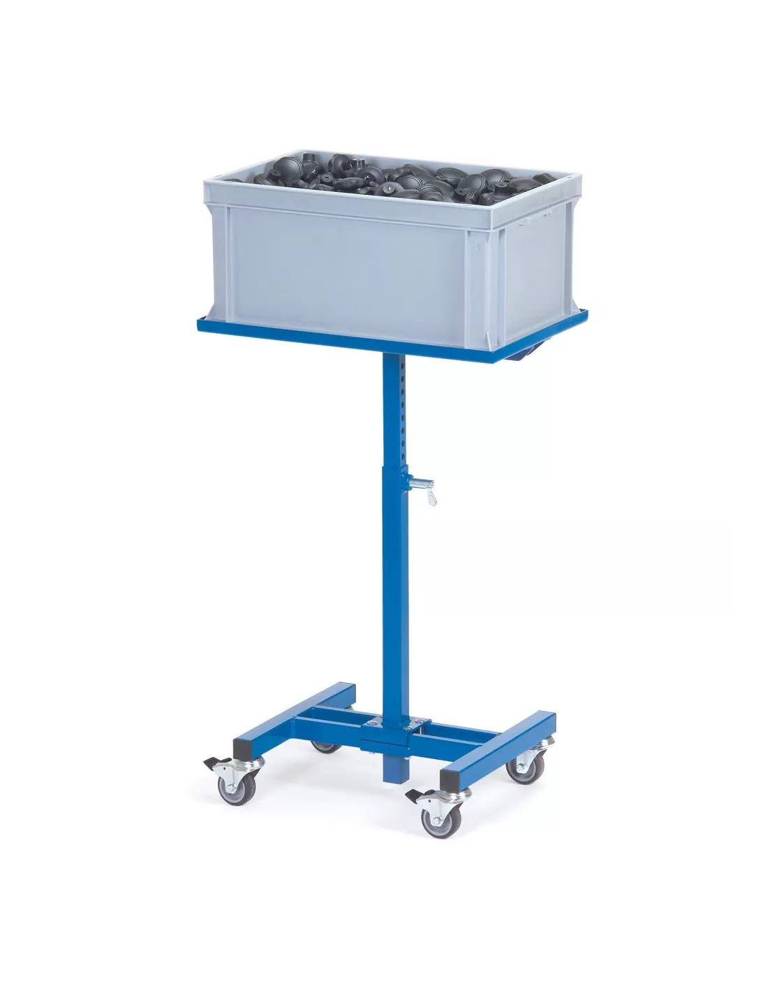 Pour bacs en plastique, bacs en tôle d'acier, corbeilles en fil métallique, etc., réglable en hauteur et mobile. Construction en profilé et tube d'acier avec plateau en tôle avec rebord de 20 mm. Non inclinable. Hauteur réglable au pas de 25 mm. Revêtement époxy bleu RAL 5007. 4 roues pivotantes à bandage TPE, roulement à palier lisse. 2 roues avec freins.