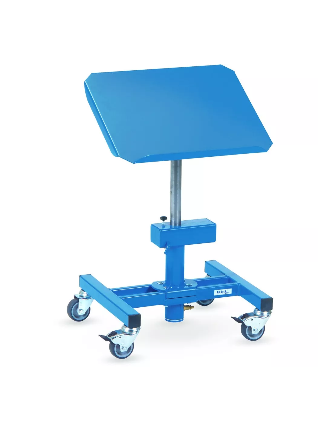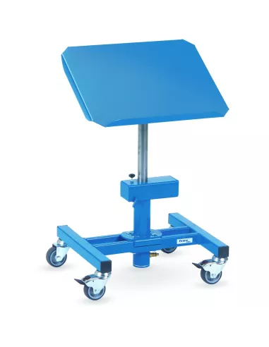 Construction en profilé et tube d'acier avec plateau en tôle d'acier et rebord de 20 mm sur un grand côté, revêtement époxy bleu RAL 5007. Pour bacs en plastiques, corbeilles en treillis etc.. Rotatif avec hauteur réglable par piston pneumatique. Inclinable de 0°, 15° et 30°. 4 roues pivotantes à bandage TPE, moyeu à palier lisse. 2 roues avec freins.
