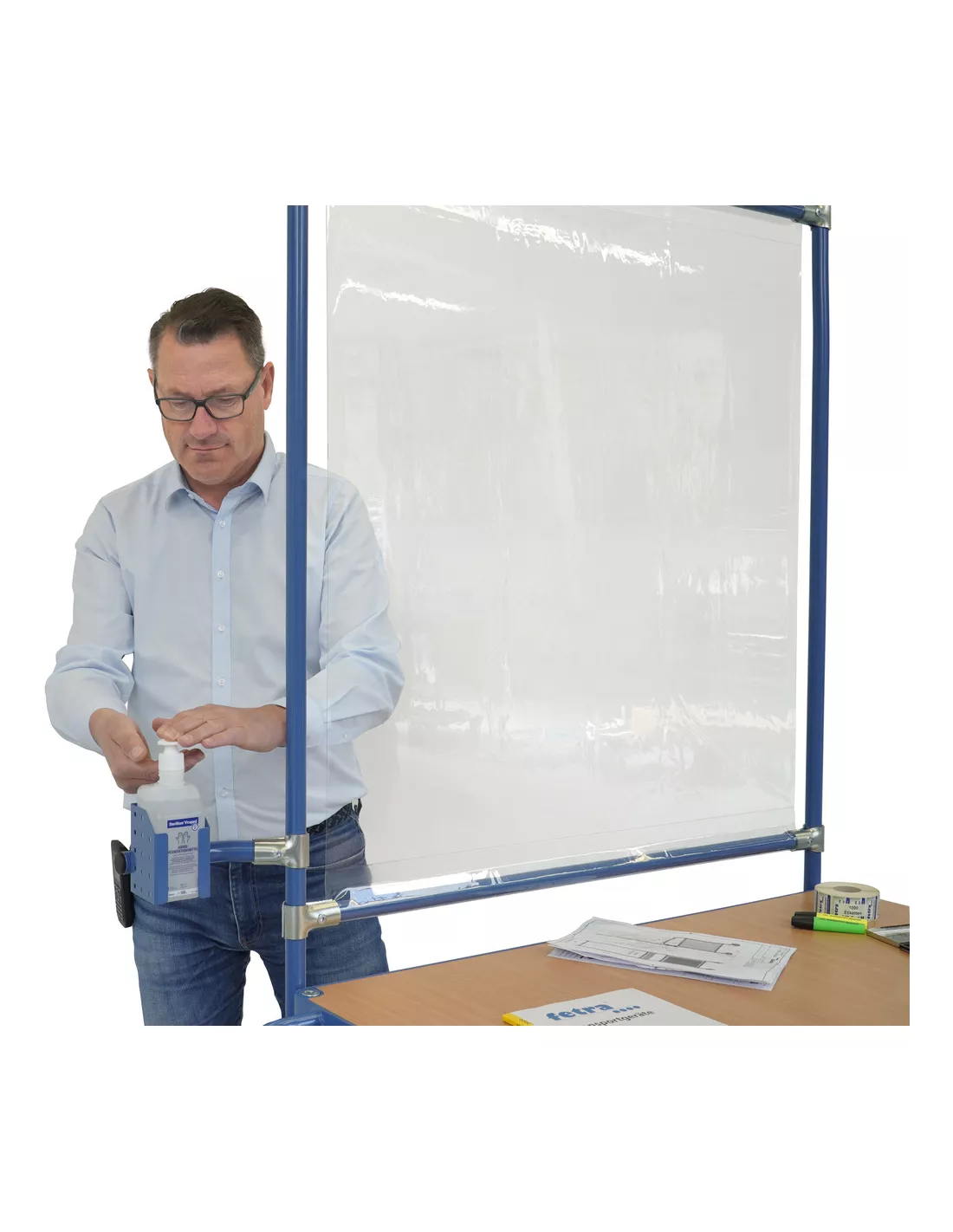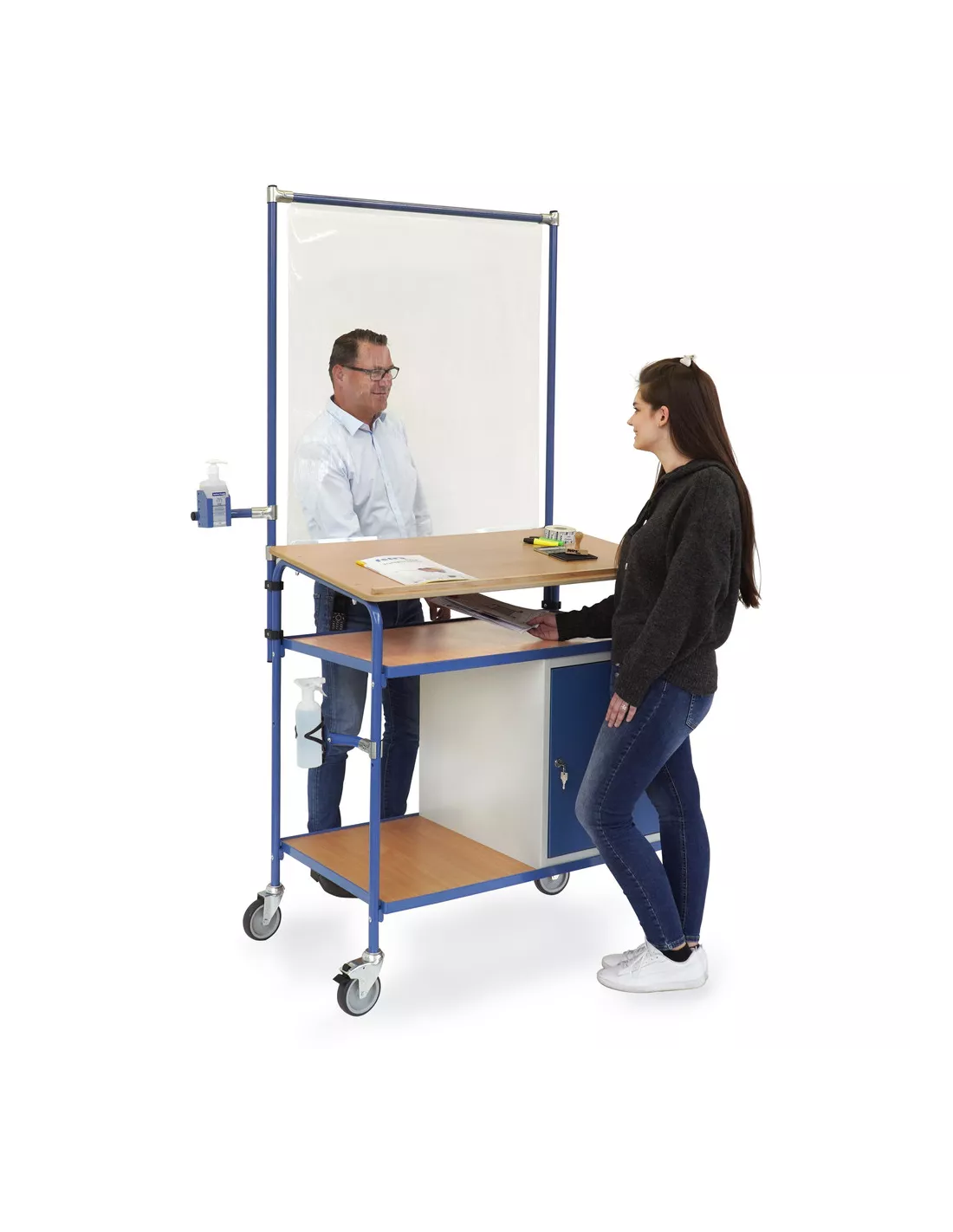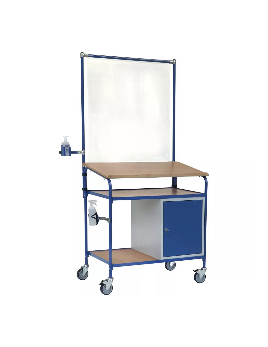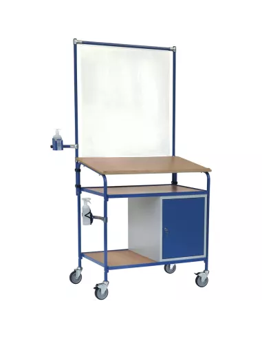 Ensemble mécano-soudé et boulonné, revêtement époxy bleu RAL 5007, dimensions écritoire (lxP): 1100 x 589 mm avec rebord, 1 placard en tôle d'acier verrouillable (LxPxH: 500 x 600 x 600 mm) avec porte, 2 plateaux réglables. 4 roues pivotantes dont 2 avec freins, moyeu à palier lisse. Charge maximum par plateau: 50 kg. Également équipé d'un panneau de projections salivaires 5942, d'un support pour produit désinfectant 1393-B0500 (pour bouteille Bode de 500 ml) et d'un support bouteille pulvérisateur 1391. Bouteilles non incluses dans la livraison.