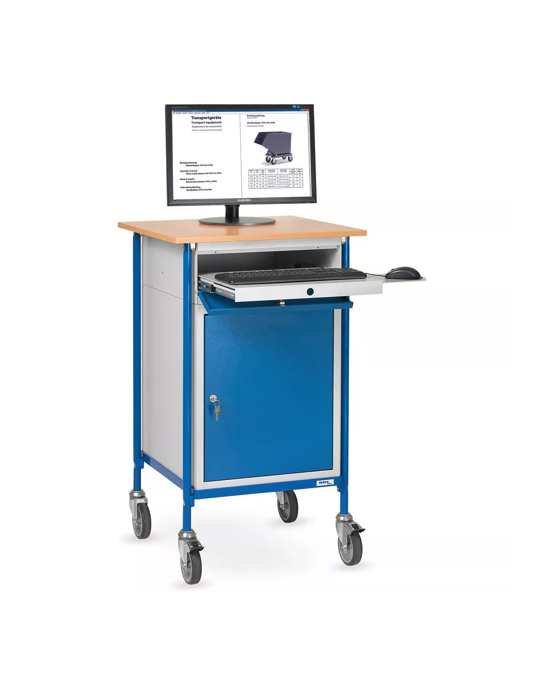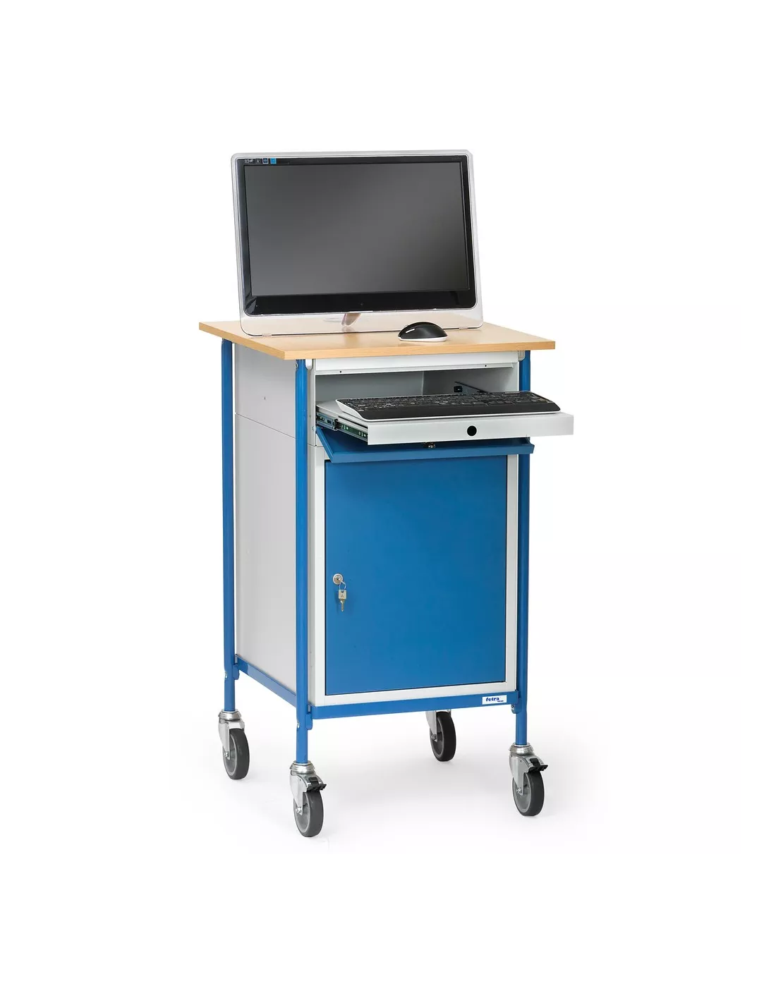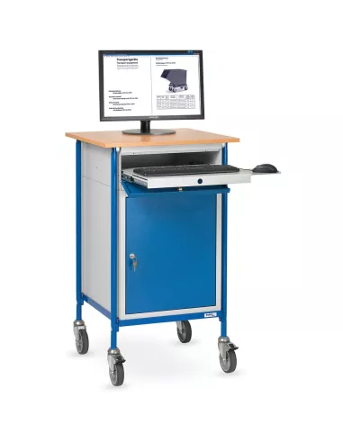 Ensemble mécano-soudé et boulonné, revêtement époxy bleu RAL 5007, 1 placard en tôle d'acier verrouillable (LxPxH: 500 x 600 x 600 mm) avec porte et 2 plateaux amovibles. Tiroir porte clavier et tapis de souris. Plateau horizontal avec ouverture pour passage des câbles vers le caisson. 4 roues pivotantes dont 2 avec freins, roulement à palier lisse. Charge maximum par plateau placard: 30 kg. Livré sans accessoires.
