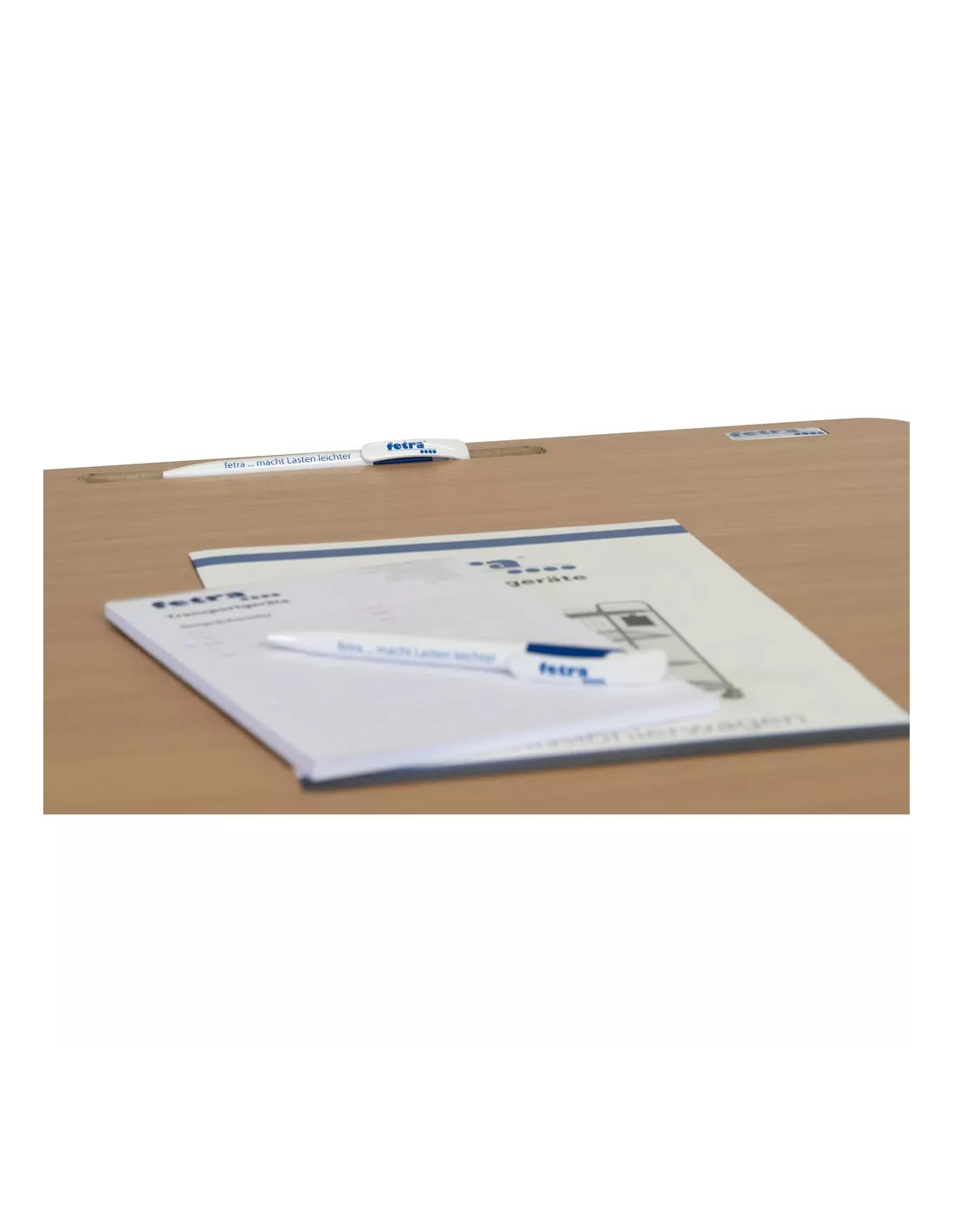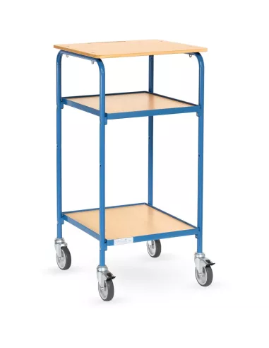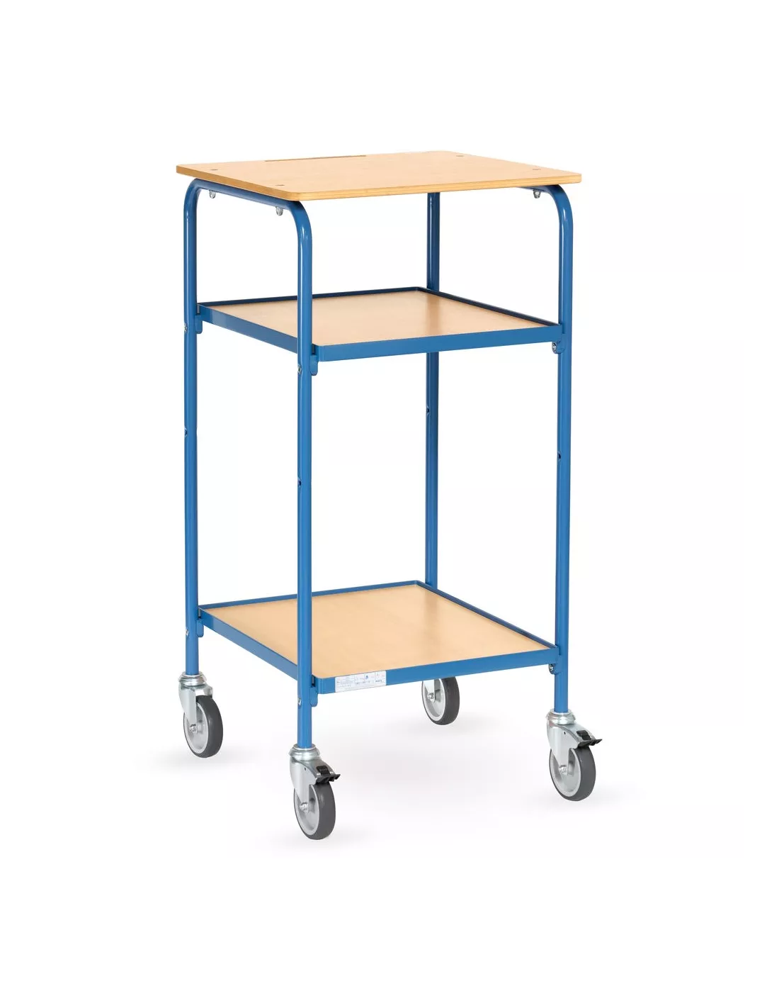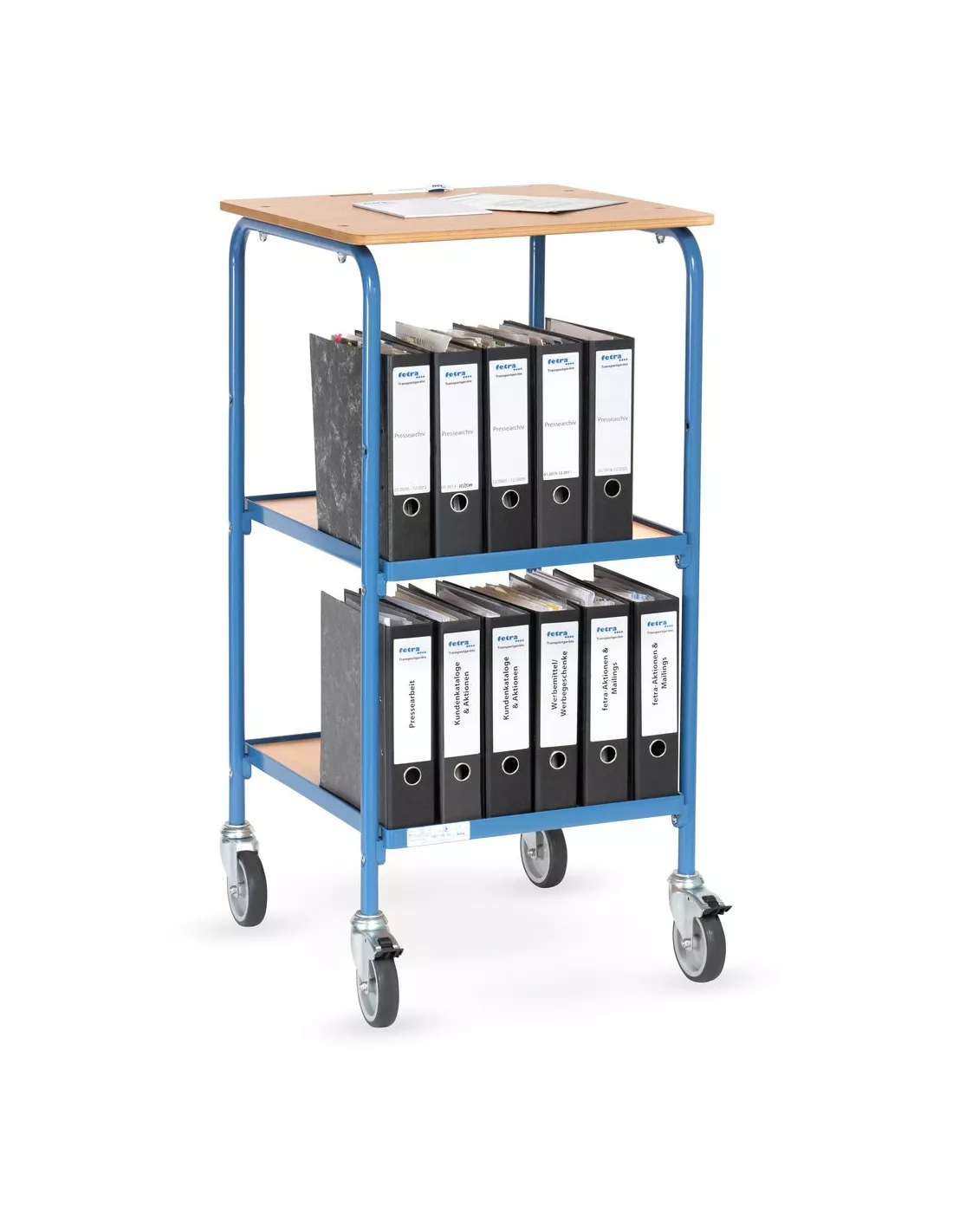Ensemble mécano-soudé et boulonné, revêtement époxy bleu RAL 5007, dimensions écritoire (lxP): 605 x 589 mm, avec porte-stylo fraisé. 2 plateaux réglables, compatible pour 2 hauteurs de classeurs. 4 roues pivotantes dont 2 avec freins, moyeu à palier lisse. Charge maximum par plateau: 50 kg.