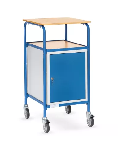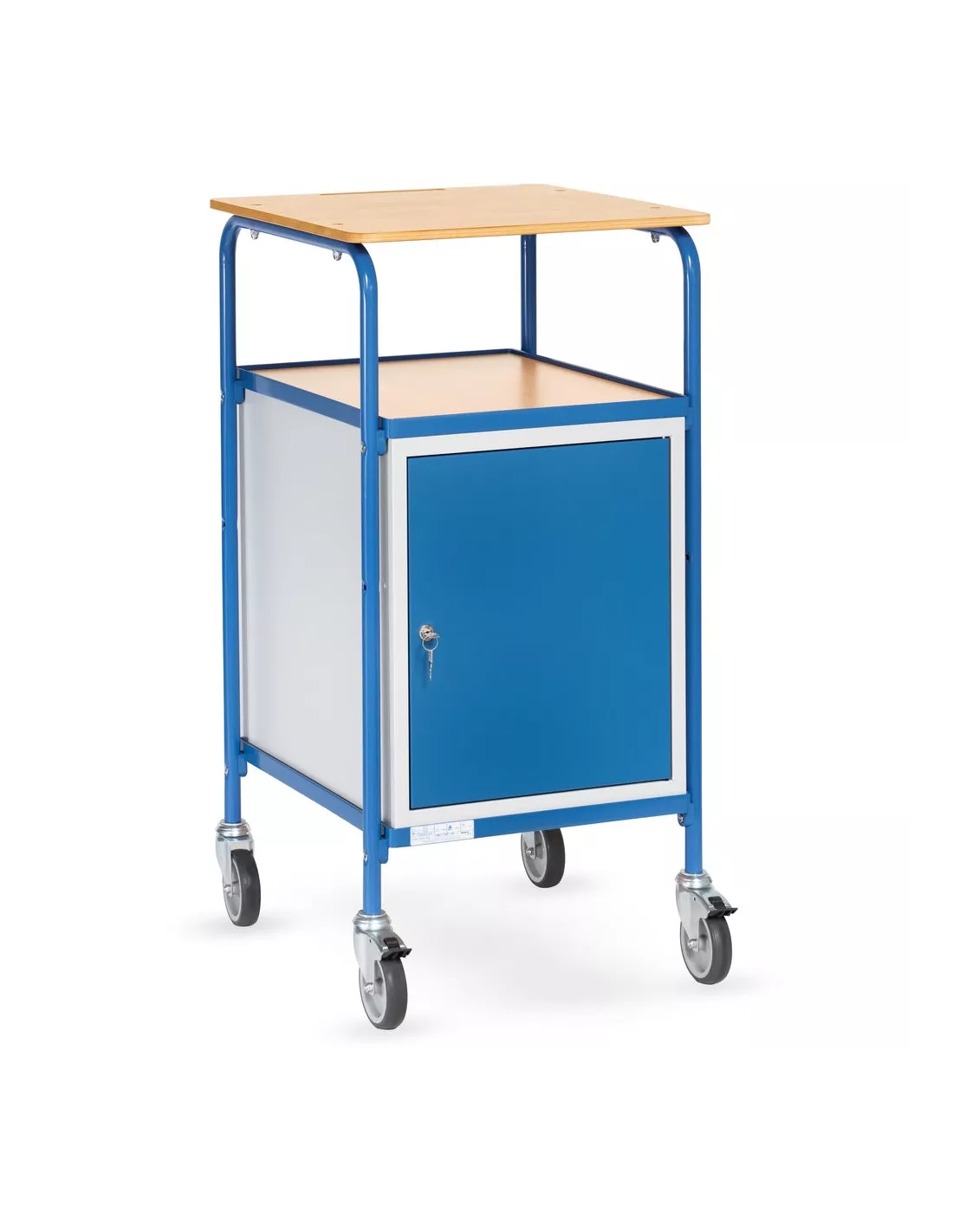 Ensemble mécano-soudé et boulonné, revêtement époxy bleu RAL 5007, dimensions écritoire (lxP): 605 x 589 mm,avec porte-stylo fraisé. 1 placard verrouillable en tôle d'acier (LXPXH: 500 x 600 x 600 mm) avec porte et 2 étagères amovibles. 4 roues pivotantes dont 2 avec freins, moyeu à palier lisse. Charge maximum par plateau: 30 kg.