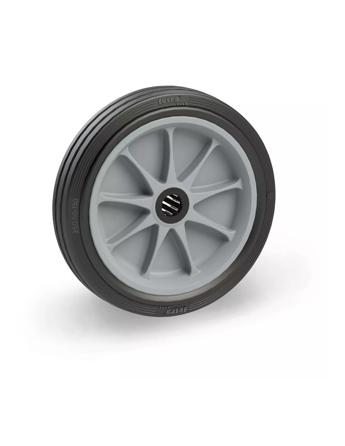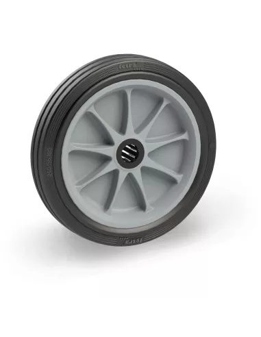 Roue caoutchouc montée sur jante en polyamide gris renforcée en fibres de verre, moyeu à roulement à rouleaux.