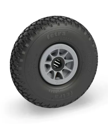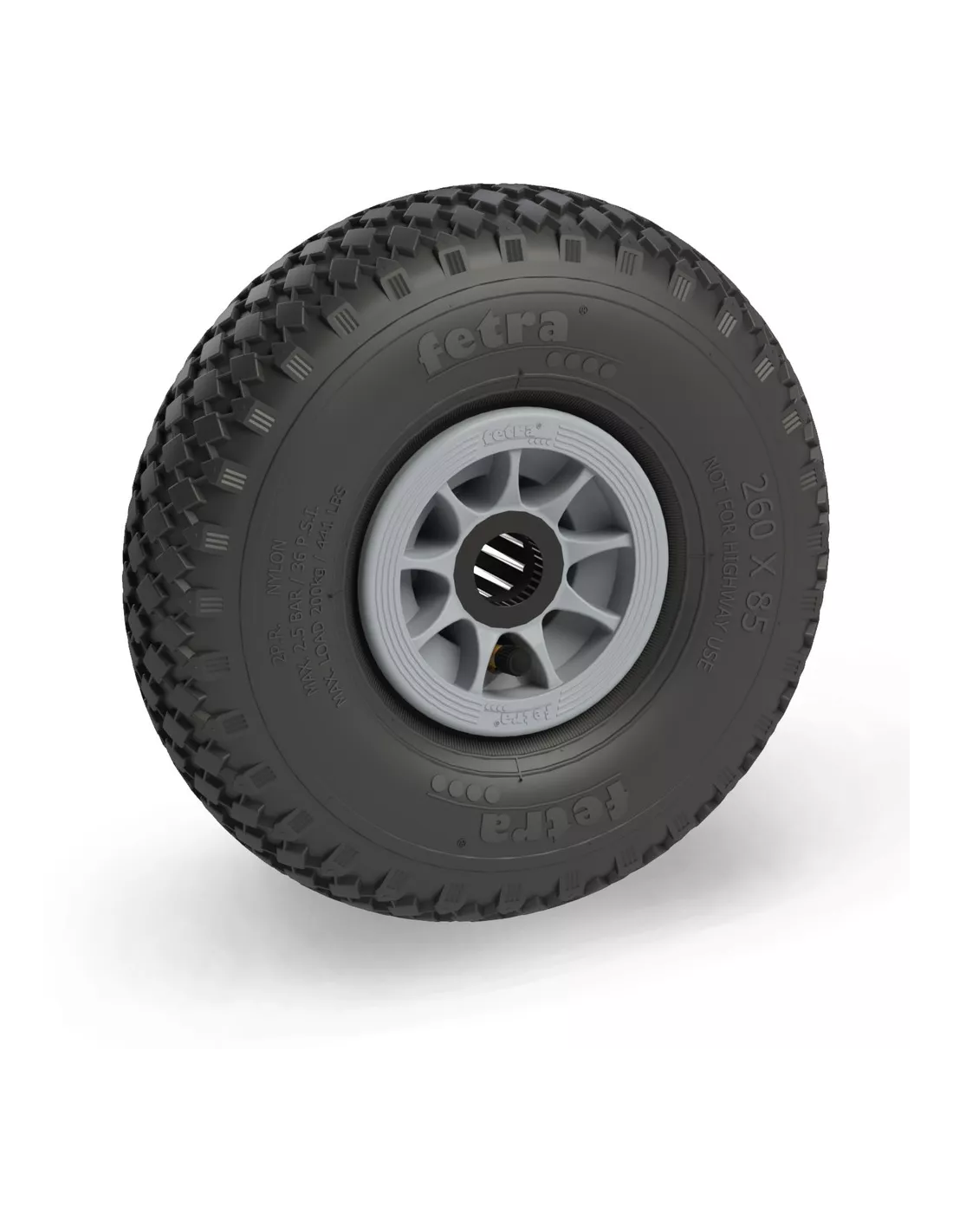 Roue gonflable montée sur jante en polyamide gris renforcée en fibres de verre, moyeu à roulement à rouleaux.