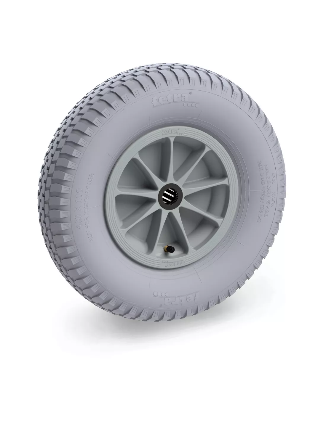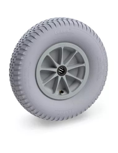 Roue gonflable montée sur jante en polyamide gris renforcée en fibres de verre, moyeu à roulement à rouleaux.