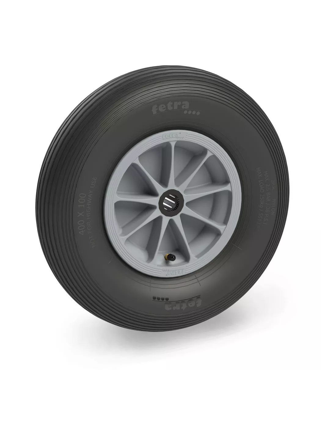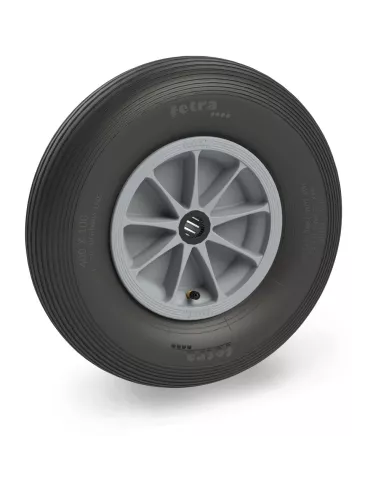 Roue gonflable montée sur jante en polyamide gris renforcée en fibres de verre, moyeu à roulement à rouleaux.