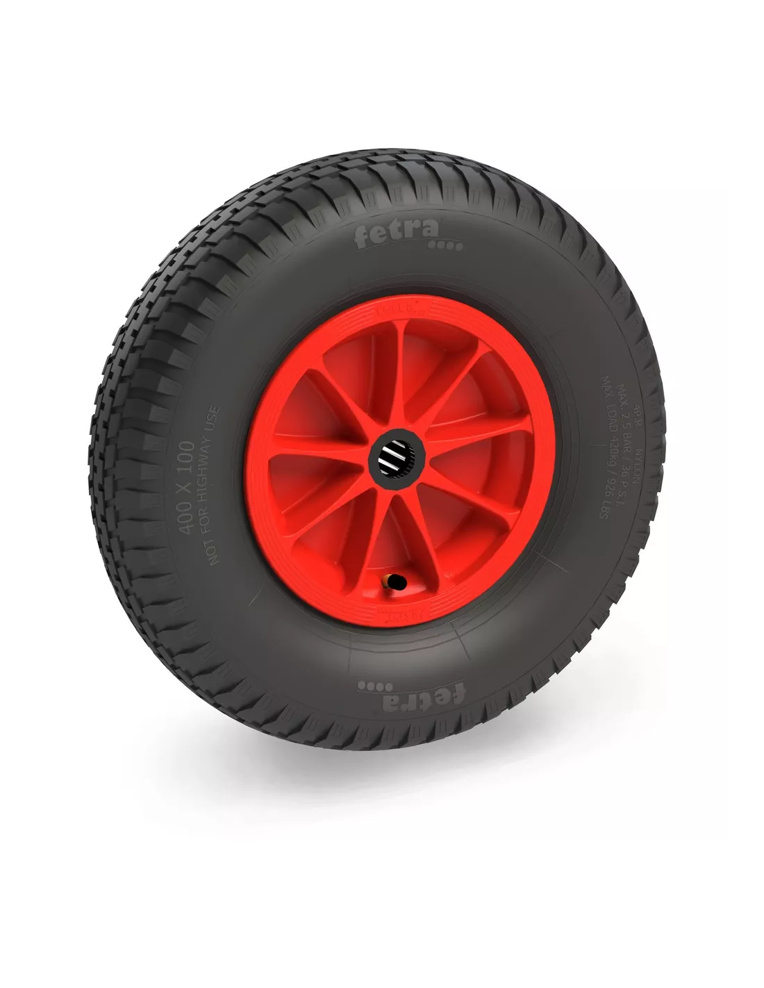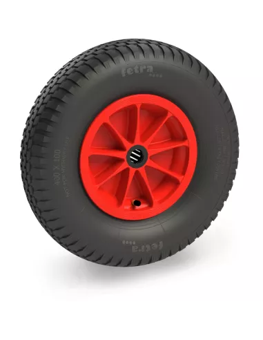 Roue gonflable montée sur jante en polyamide rouge renforcée en fibres de verre, moyeu à roulement à rouleaux.