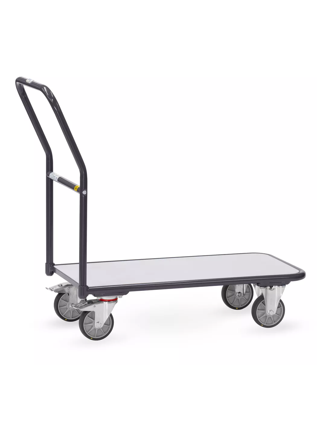Tous les éléments sont conducteurs d'électricité. Ensemble mécano-soudé, revêtement époxy gris foncé. 1 plateau gris clair conforme à la Norme DIN 68765. 2 roues pivotantes et 2 fixes à bandage TPE-ESD (Élastomère thermoplastique), conductrices d'électricité, moyeu à roulement à billes de précision. Déplacement confortable: Peu de résistance au démarrage, au déplacement et à la rotation. Déplacement peu bruyant sur sols plats, bandage non traçant. Freins sur roues pivotantes.