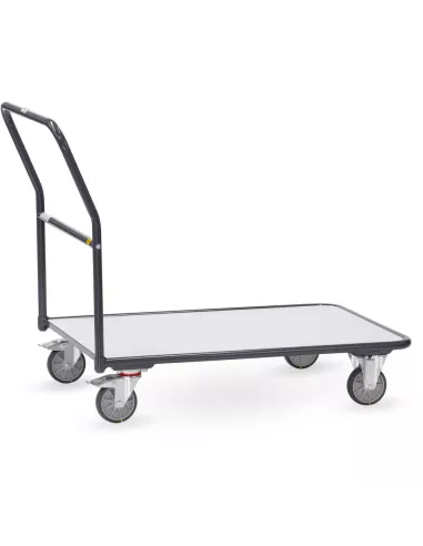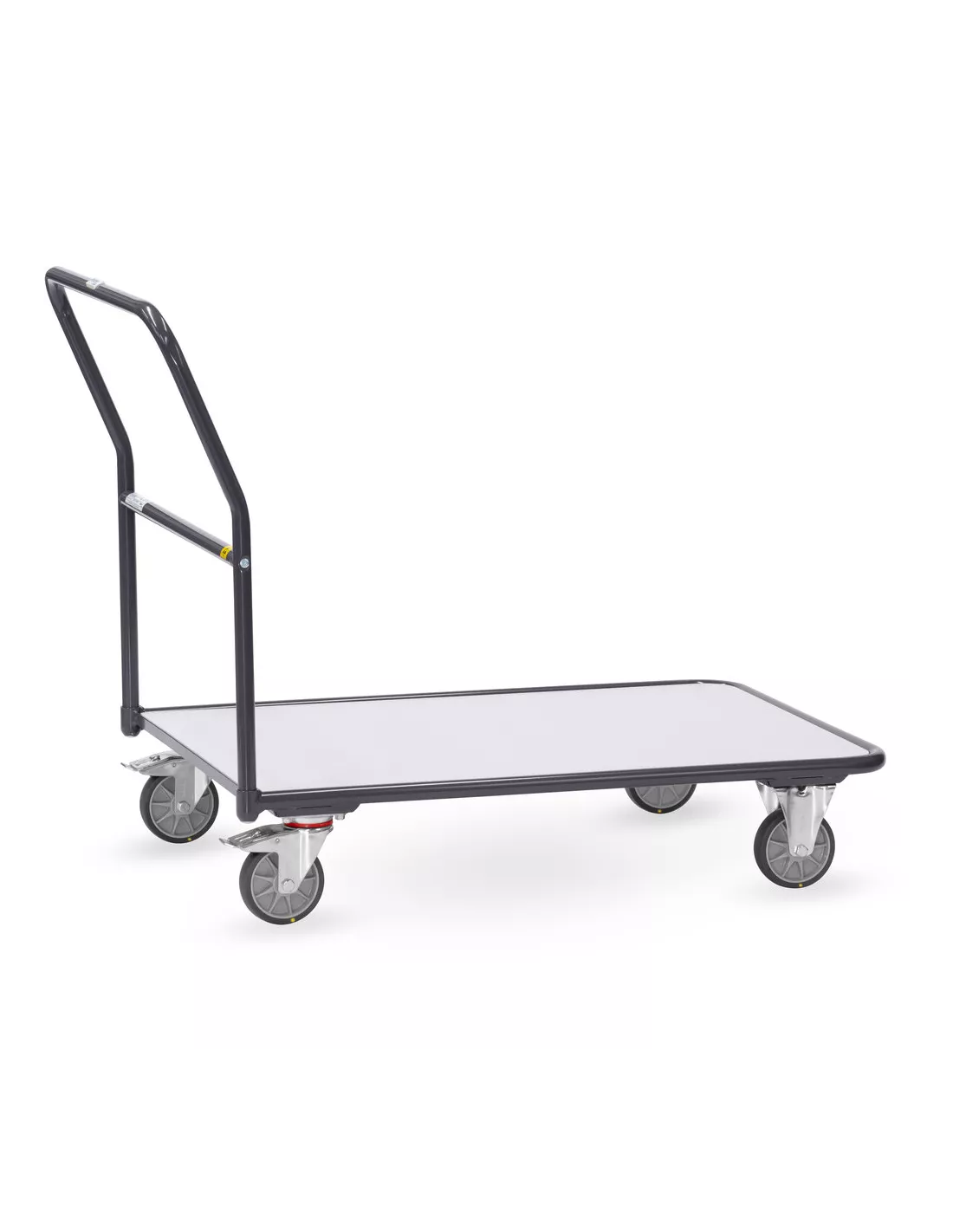 Tous les éléments sont conducteurs d'électricité. Ensemble mécano-soudé, revêtement époxy gris foncé. 1 plateau gris clair conforme à la Norme DIN 68765. 2 roues pivotantes et 2 fixes à bandage TPE-ESD (Élastomère thermoplastique), conductrices d'électricité, moyeu à roulement à billes de précision. Déplacement confortable: Peu de résistance au démarrage, au déplacement et à la rotation. Déplacement peu bruyant sur sols plats, bandage non traçant. Freins sur roues pivotantes.