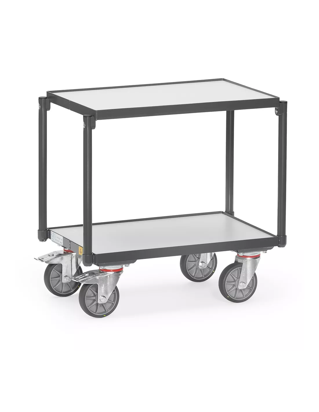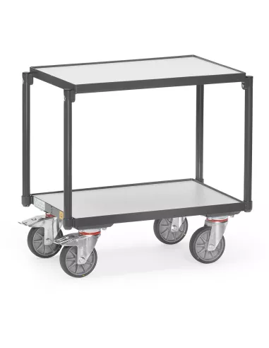 En profilé et tube d'acier soudé, revêtement époxy conducteur d'électricité gris ardoise RAL 7015. Plateaux en mélaminé conducteurs d'électricité conformément à la Norme 68765, gris clair. 4 roues pivotantes à bandage TPE-ESD, conductrices d'électricité, moyeu à roulement à bille central. 2 roues avec freins. Charge plateau haut: 100 kg. Avec 2 plateaux en mélaminé conducteurs d'électricité, rebord de 7 mm. Distance entre les plateaux: 400 mm. Compatible pour bacs plastiques 600 x 400 mm.