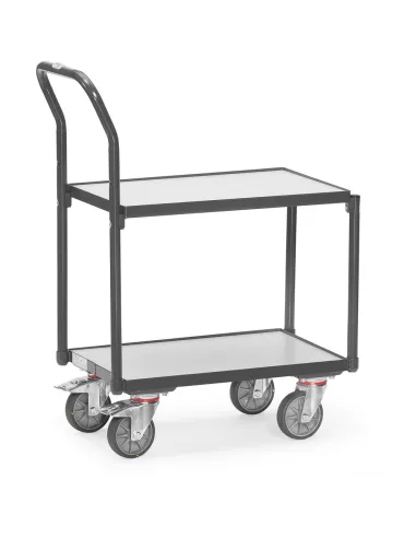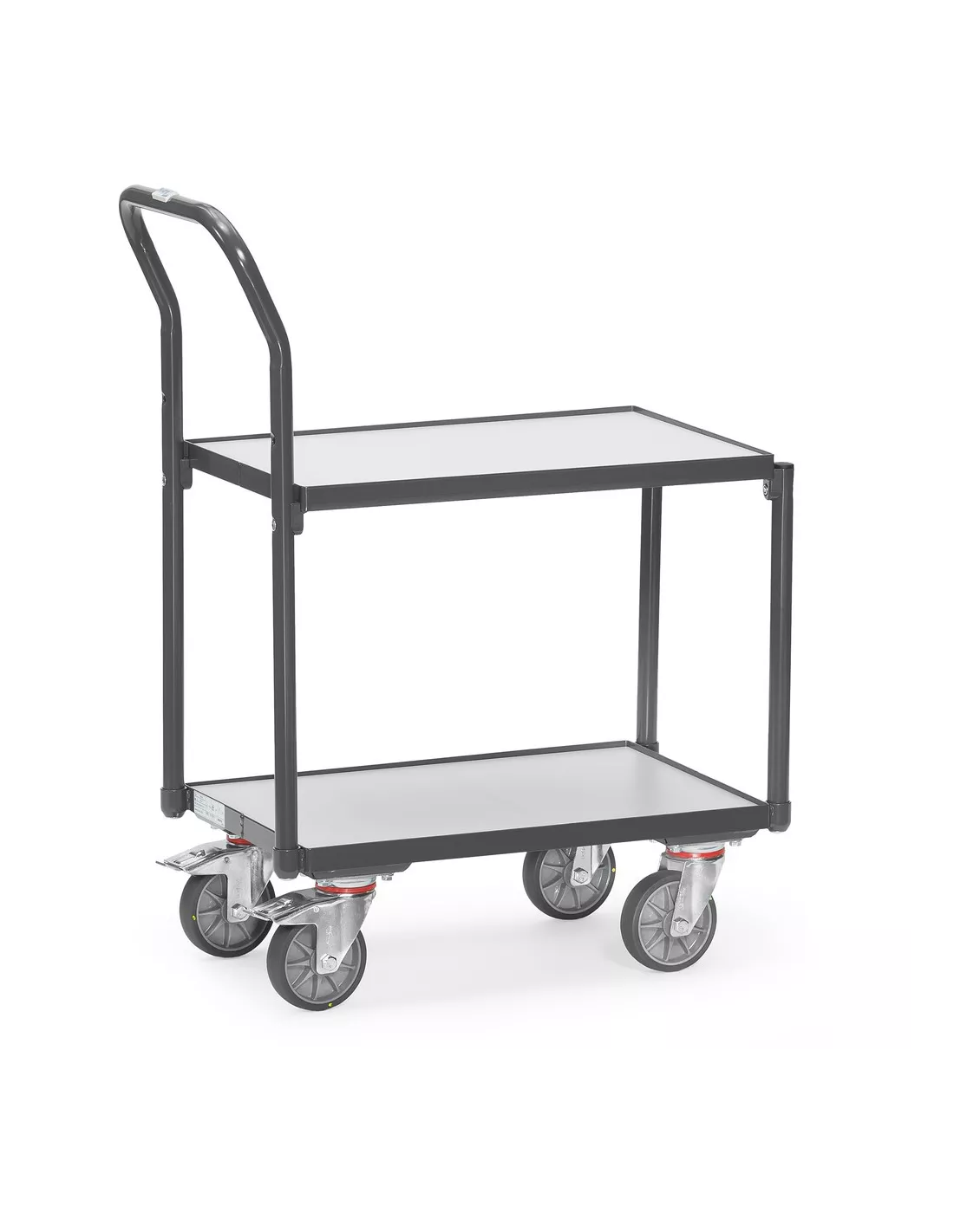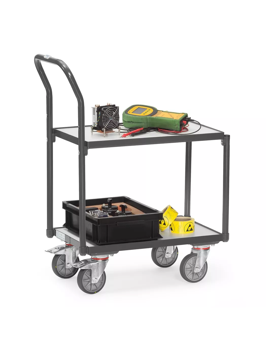 En profilé et tube d'acier soudé, revêtement époxy conducteur d'électricité gris ardoise RAL 7015. Plateaux en mélaminé conducteurs d'électricité conformément à la Norme 68765, gris clair. 4 roues pivotantes à bandage TPE-ESD, conductrices d'électricité, moyeu à roulement à bille central. 2 roues avec freins. Avec dossier de poussée. Charge plateau haut: 100 kg. Avec 2 plateaux en mélaminé conducteurs d'électricité, rebord de 7 mm. Distance entre les plateaux: 400 mm. Compatible pour bacs plastiques 600 x 400 mm.