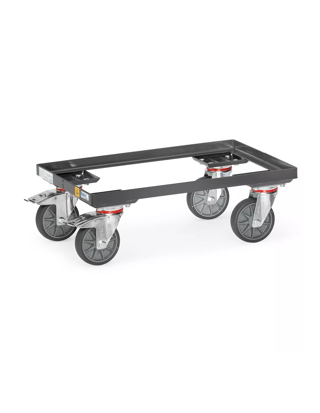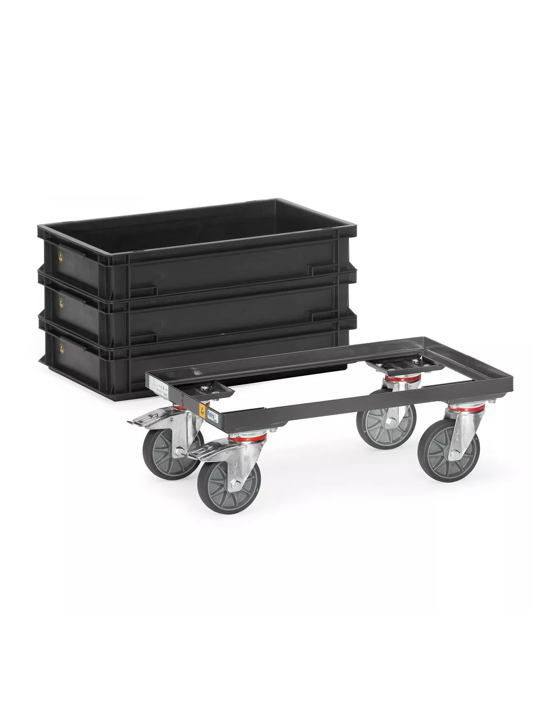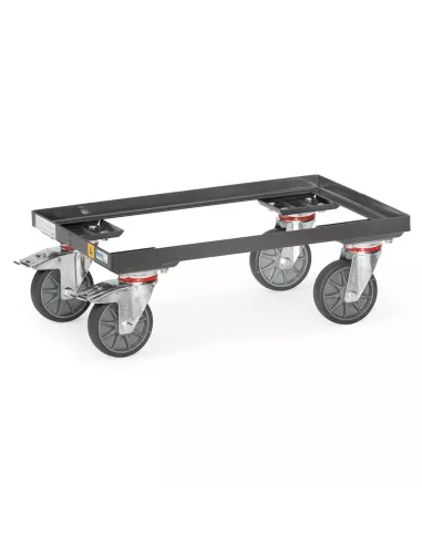 En profilé et tube d'acier soudé, revêtement époxy conducteur d'électricité gris ardoise RAL 7015. Armature ouverte sans plateaux. Compatible pour bacs plastiques 600 x 400 mm. 4 roues pivotantes à bandage TPE-ESD, conductrices d'électricité, moyeu à roulement à bille central. 2 roues avec freins.