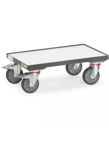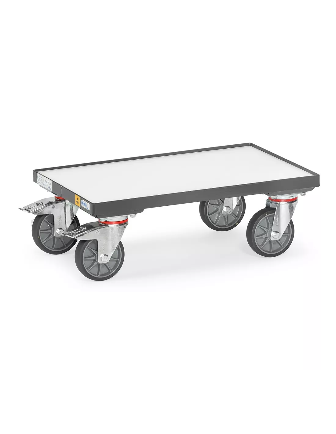 En profilé et tube d'acier soudé, revêtement époxy conducteur d'électricité gris ardoise RAL 7015. Plateaux en mélaminé conducteurs d'électricité conformément à la Norme 68765, gris clair. 4 roues pivotantes à bandage TPE-ESD, conductrices d'électricité, moyeu à roulement à bille central. 2 roues avec freins. Avec dossier de poussée. Avec plateaux en mélaminé conducteurs d'électricité, rebord de 7 mm. Compatible pour bacs plastiques 600 x 400 mm.