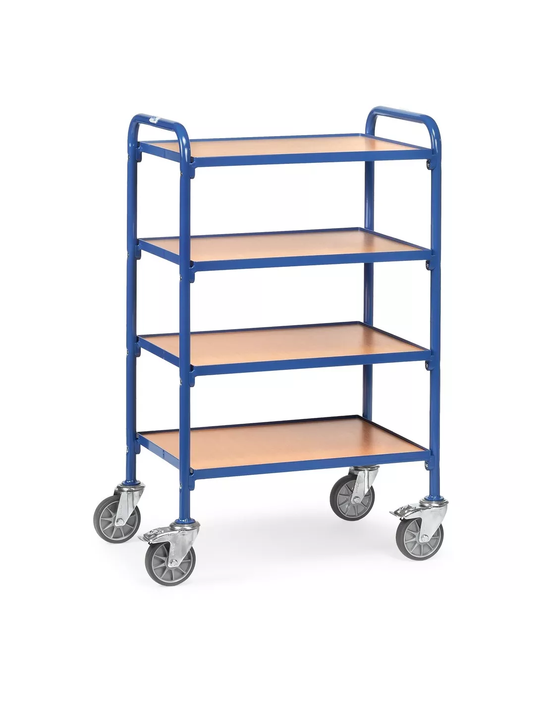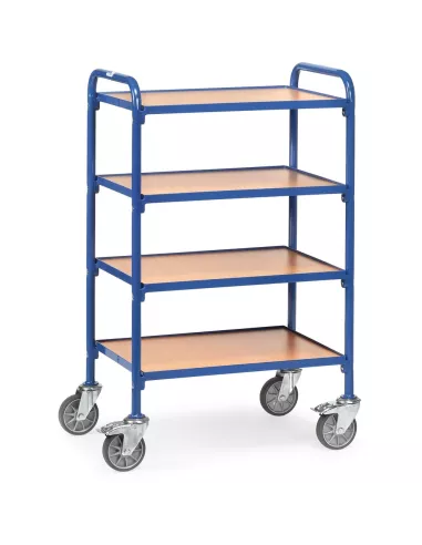 Ensemble mécano-soudé, revêtement époxy bleu RAL 5007. 4 plateaux en mélaminé surface effet hêtre avec rebord de 10 mm. 4 roues pivotantes à bandage TPE, moyeu à roulement à billes. 2 roues avec freins. Charge par plateau: 60 kg. Livré sans bacs.