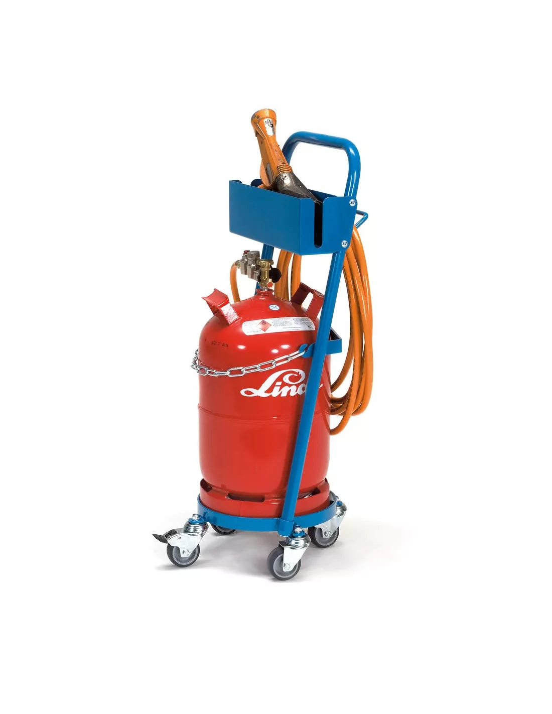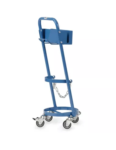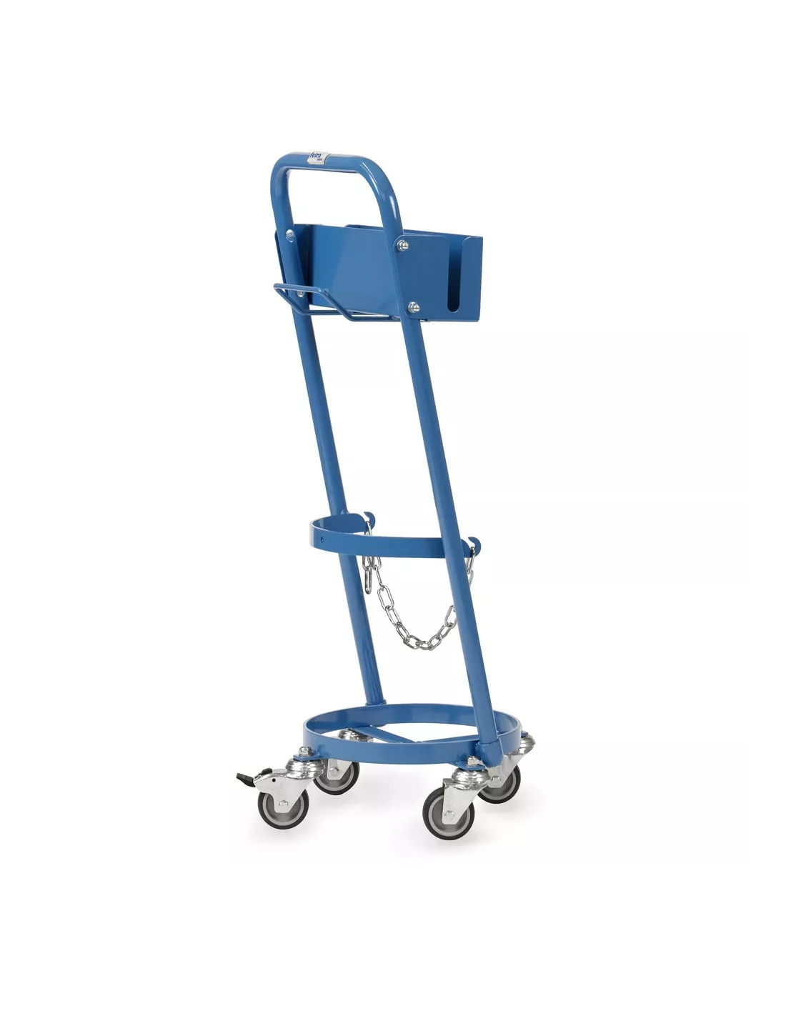 Construction en tube d'acier soudé, revêtement époxy bleu RAL 5007. Rouleur de bouteilles avec chaîne de maintien et poignée d'accrochage du tuyau et support de pistolet à gaz. Pour 1 bouteille de propane de 11 kg, Ø 300 mm. 4 roues pivotantes à bandage caoutchouc 75 x 25 mm, moyeu à roulement à rouleaux. 2 roues avec freins.