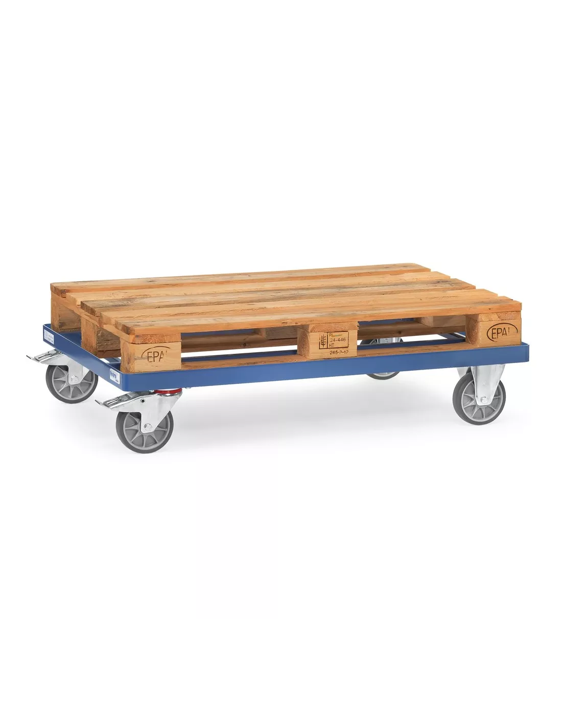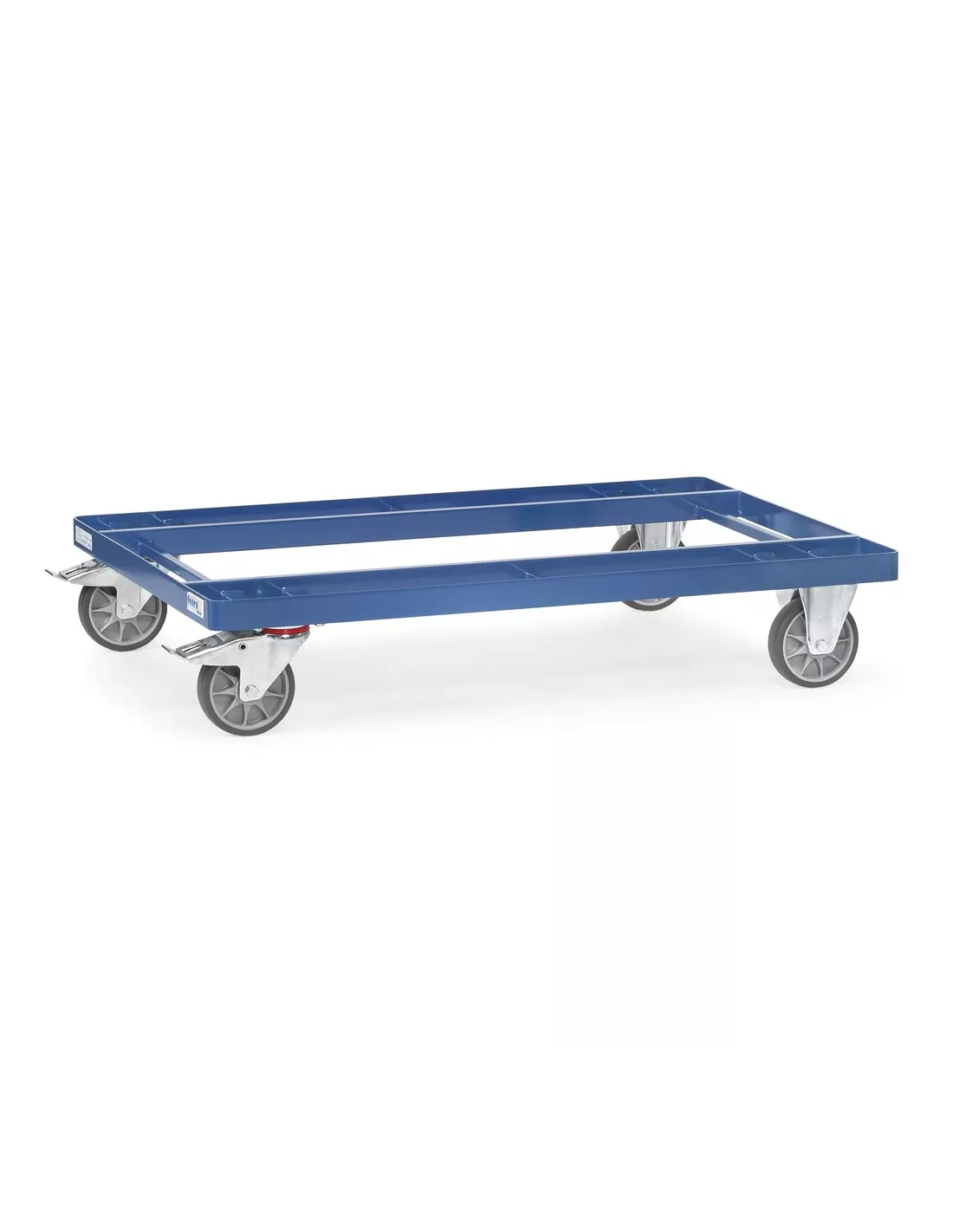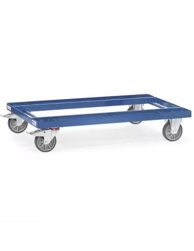 Châssis en acier plat avec longerons en tube carré, revêtement époxy bleu RAL 5007. Sans cornières d'angle. Les longerons étant positionnés 20 mm en-dessous du châssis, les palettes peuvent être transportées en toute sécurité. Rouleur de palettes pour palettes bois ou grillagées. 2 roues fixes et 2 roues pivotantes à bandage TPE, moyeu à roulement à billes. Freins sur roues pivotantes. Déplacement peu bruyant sur sols plats, bandage non traçant. *Aucunes des options telles que rehausse, dossier de poussée, dossier de poussée amovible et timon et attache ne sont livrables pour le rouleur de palettes charge légère.