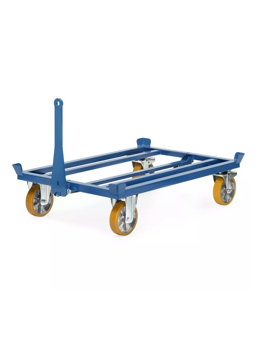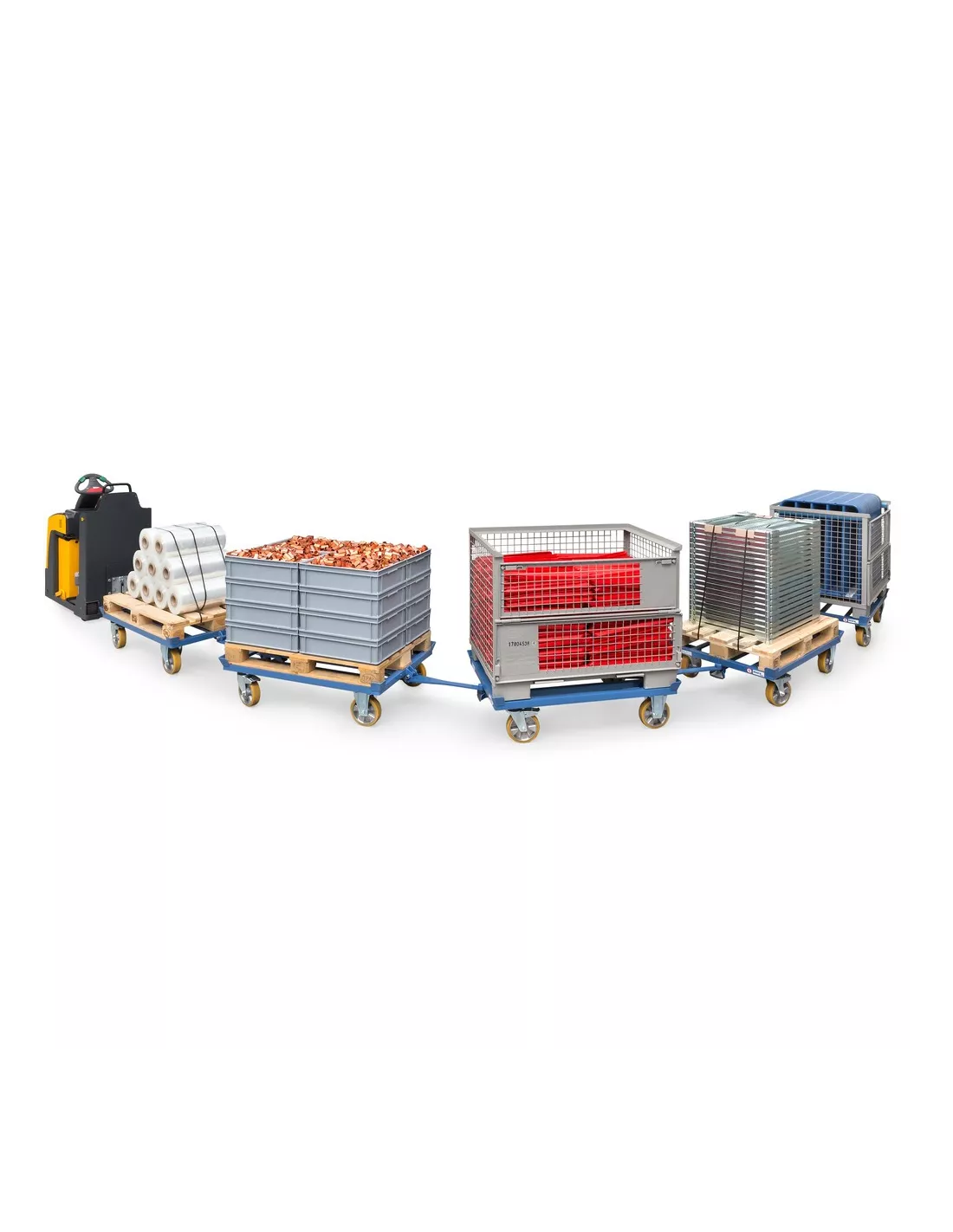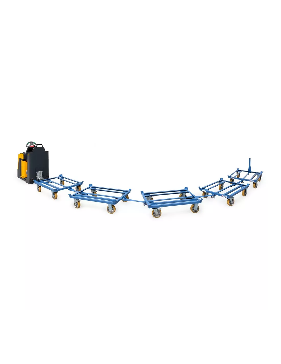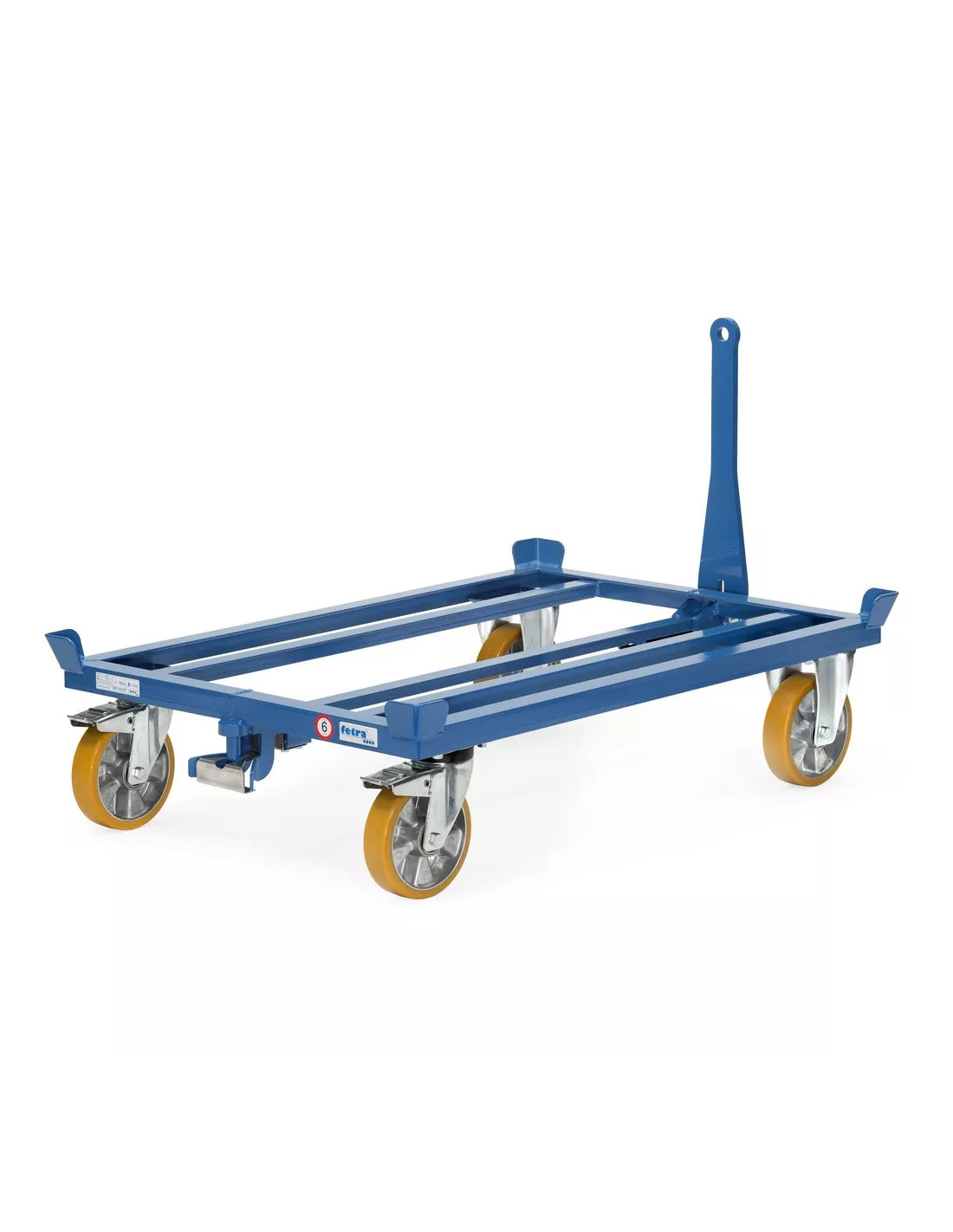 Construction robuste en profilé d'acier avec 4 coins de centrage, revêtement époxy bleu RAL 5007, 2 roues pivotantes et 2 fixes avec chapes robustes prévues pour le déplacement en train, roues à bandage polyuréthane sur jante en alu. Moyeu à roulement à billes de précision. Bandage non traçant, déplacement silencieux sur sols plats. Charge 1.000 kg, Timon sécurisé en fer plat, mise en place par pression du pied, se met en position verticale automatiquement par vérin à gaz. Du côté des roues pivotantes une attache et broche avec blocage sécurisé. Cette construction permet un déplacement en train très précis. Les tracteurs doivent être articulés à l'avant et disposer d'un timon de traction! Un maximum de 5 rouleurs par convoi avec une vitesse maximale de 6 km/h et charge maxi de 3.000 kg.