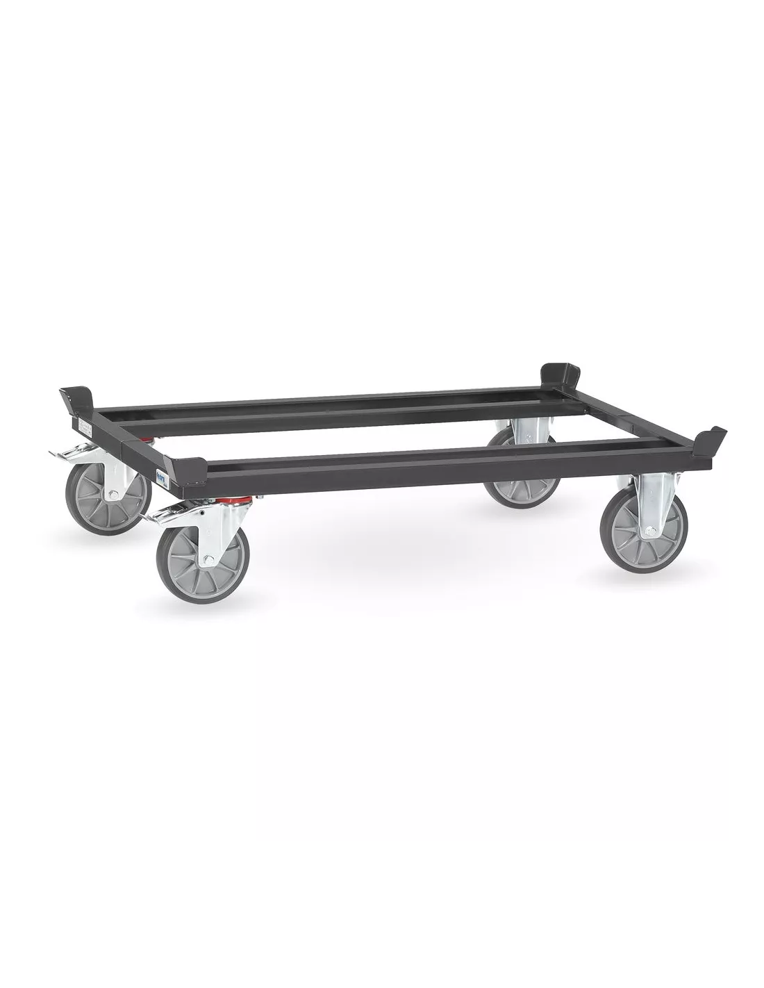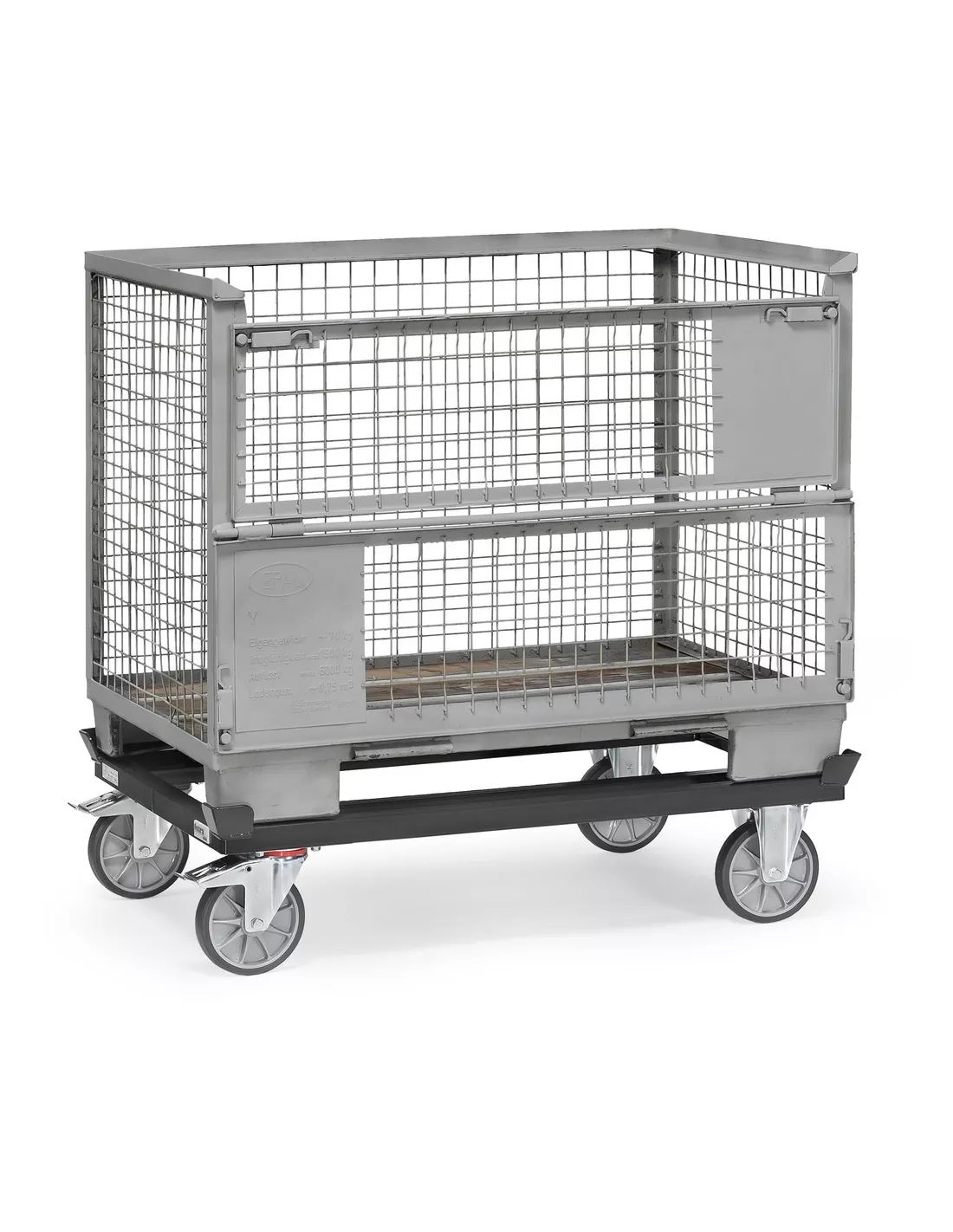 Construction en profilé d'acier mécano-soudé, revêtement époxy gris anthracite RAL 7016, avec 4 inserts support de palettes. Pour palettes bois ou grillagées. 2 roues fixes et 2 roues pivotantes à bandage TPE, moyeu à roulement à billes. Freins sur roues pivotantes. Déplacement peu bruyant sur sols plats, bandage non traçant.