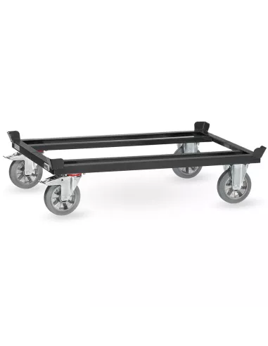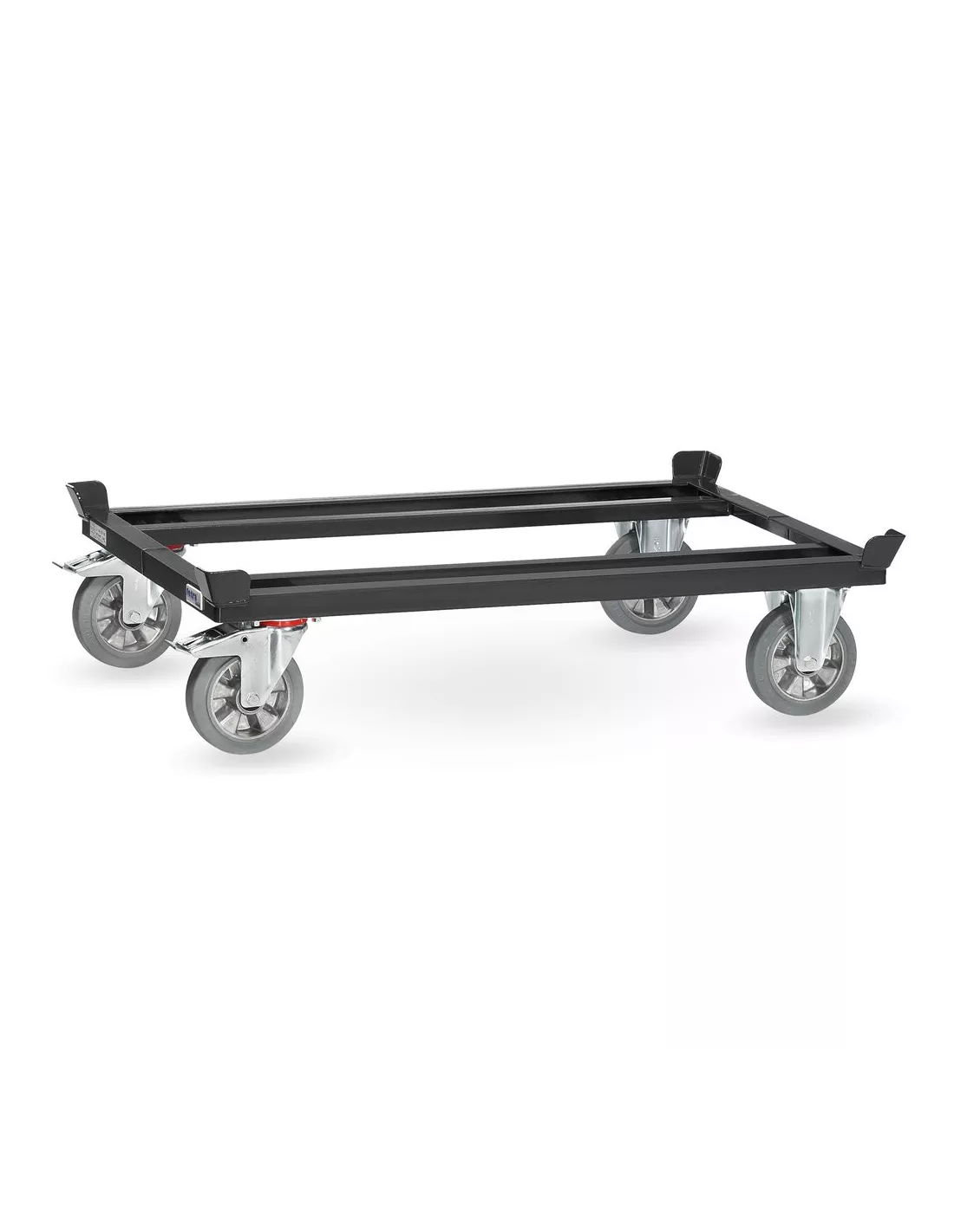 Construction en profilé d'acier mécano-soudé, revêtement époxy gris anthracite RAL 7016, avec 4 inserts support de palettes. Pour palettes bois ou grillagées. 2 roues fixes et 2 roues pivotantes à bandage caoutchouc élastique confort, bleu-gris non traçant, moyeu à roulement à billes. Freins sur roues pivotantes. Peu de résistance au déplacement. Roulement élastique, sans bruit.