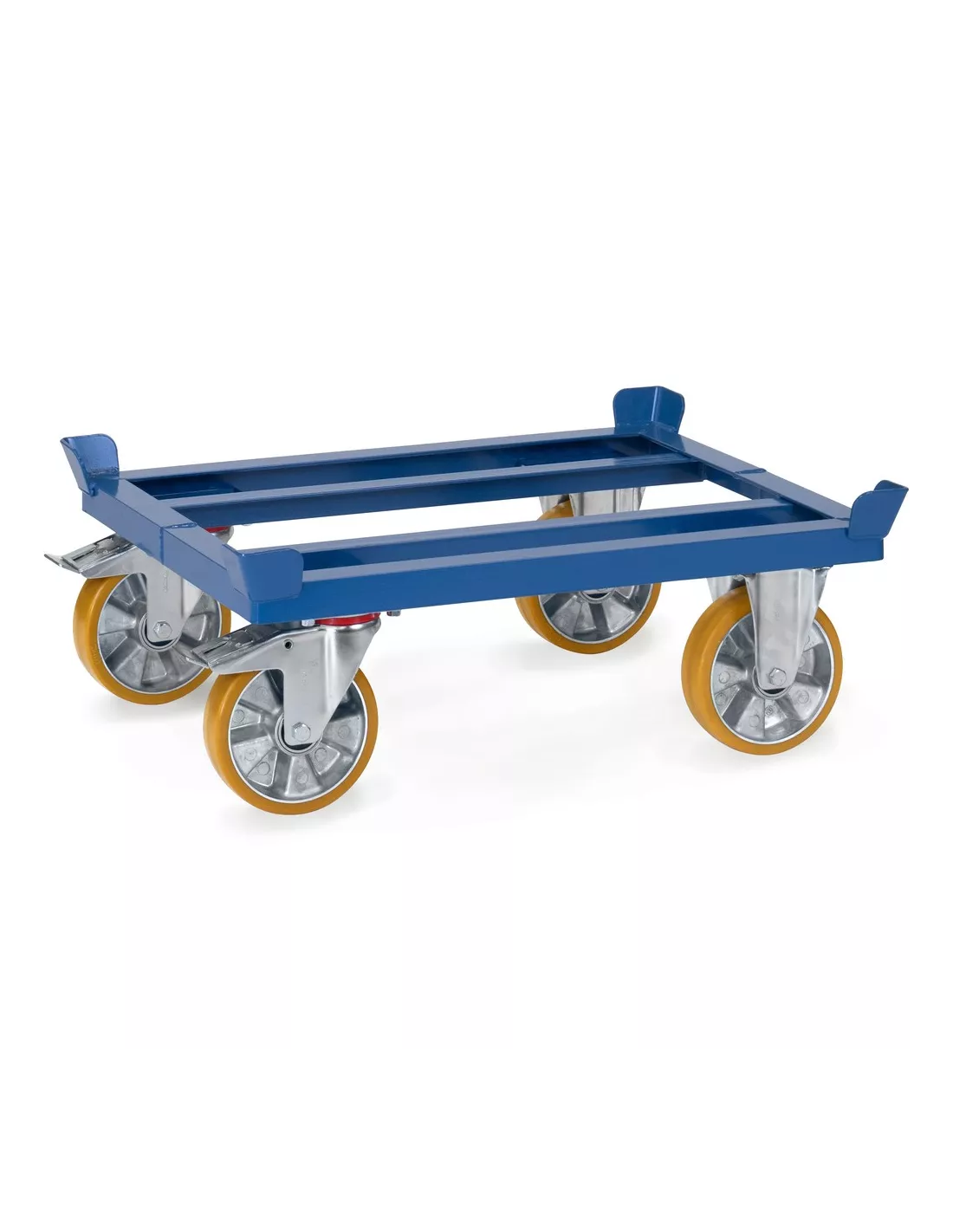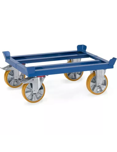 Construction en profilé d'acier mécano-soudé, revêtement époxy bleu RAL 5007, avec 4 inserts support de palettes. Pour palettes bois ou grillagées. 2 roues fixes et 2 roues pivotantes en polyuréthane jante en aluminium, moyeu à roulement à billes. Freins sur roues pivotantes. Peu de résistance au démarrage et à la rotation. Déplacement silencieux sur sols plats. Roues non traçantes.