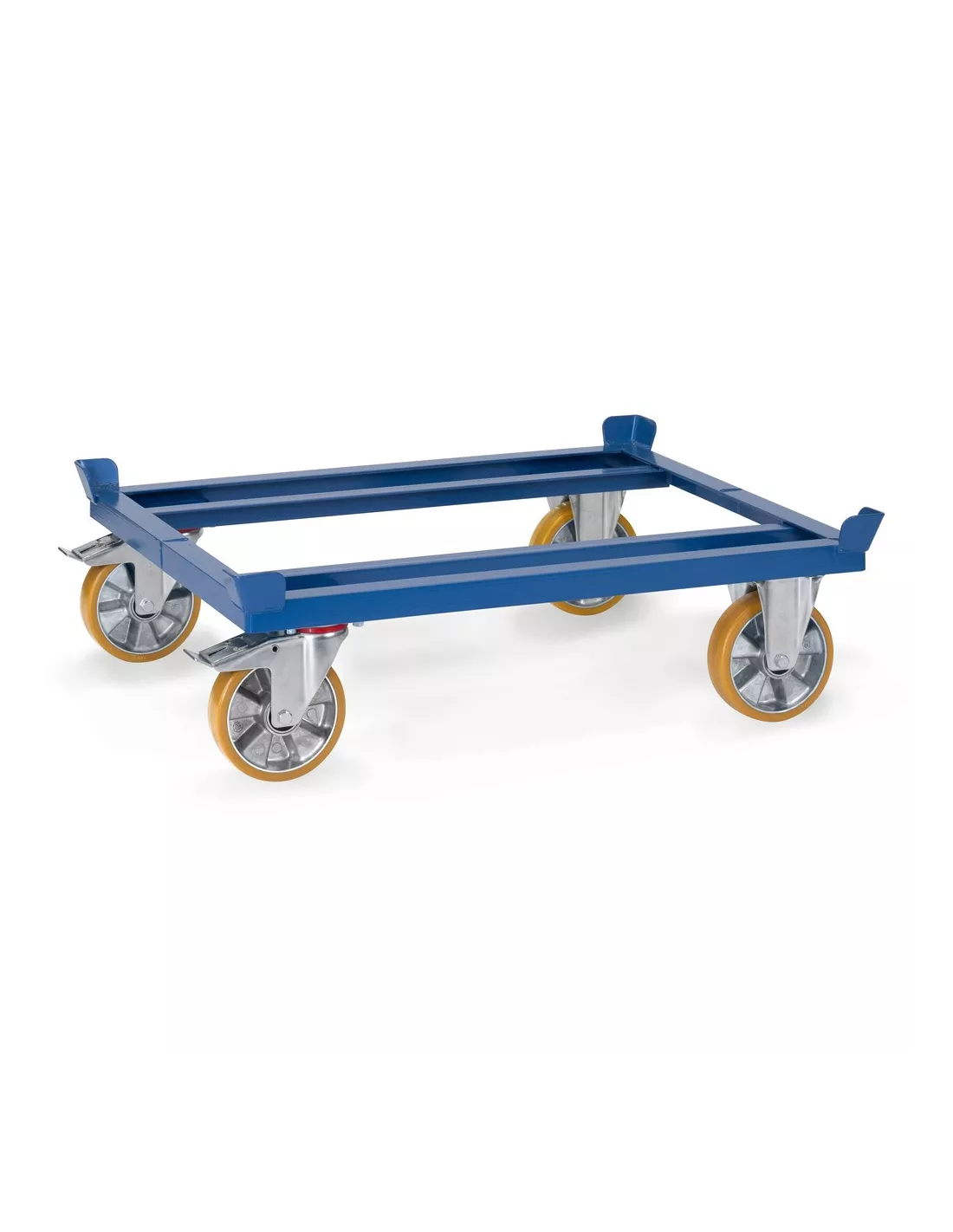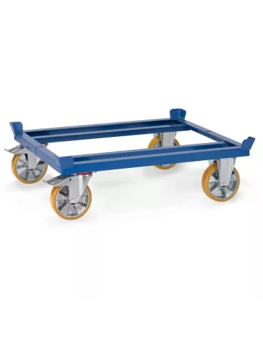 Construction en profilé d'acier mécano-soudé, revêtement époxy bleu RAL 5007, avec 4 inserts support de palettes. Pour palettes bois ou grillagées. 2 roues fixes et 2 roues pivotantes en polyuréthane jante en aluminium, moyeu à roulement à billes. Freins sur roues pivotantes. Peu de résistance au démarrage et à la rotation. Déplacement silencieux sur sols plats. Roues non traçantes.