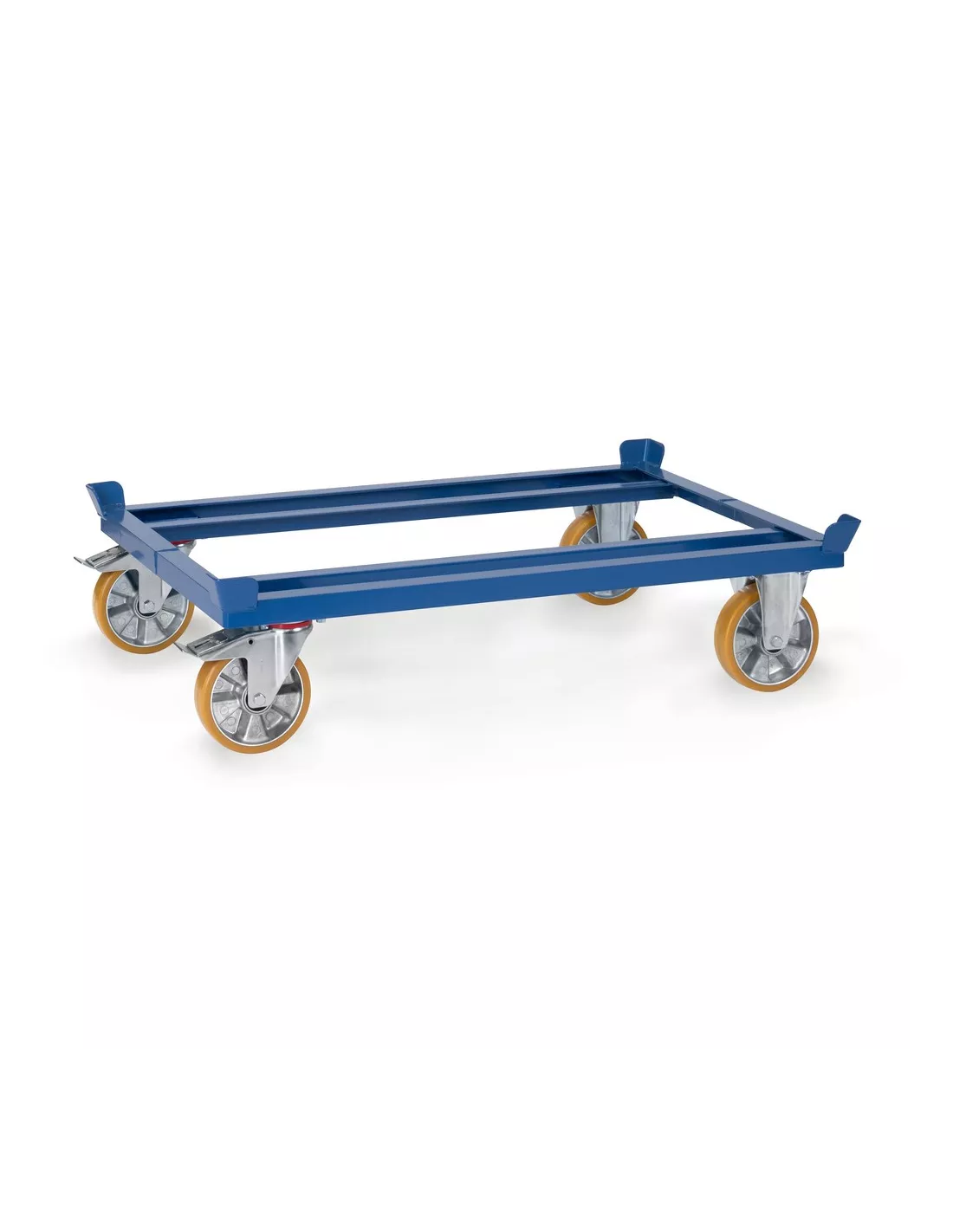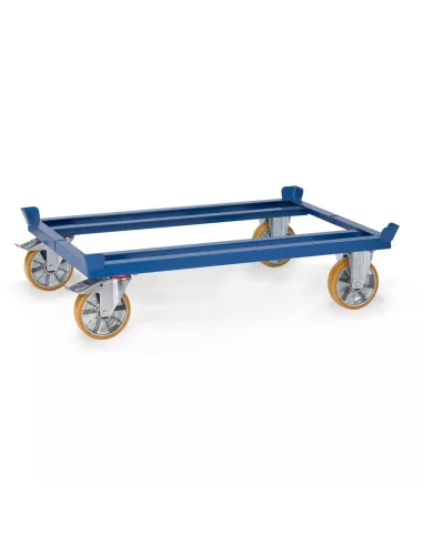 Construction en profilé d'acier mécano-soudé, revêtement époxy bleu RAL 5007, avec 4 inserts support de palettes. Pour palettes bois ou grillagées. 2 roues fixes et 2 roues pivotantes en polyuréthane jante en aluminium, moyeu à roulement à billes. Freins sur roues pivotantes. Peu de résistance au démarrage et à la rotation. Déplacement silencieux sur sols plats. Roues non traçantes.
