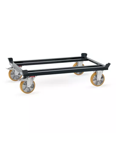 Construction en profilé d'acier mécano-soudé, revêtement époxy gris anthracite RAL 7016, avec 4 inserts support de palettes. Pour palettes bois ou grillagées. 2 roues fixes et 2 roues pivotantes en polyuréthane jante en aluminium, moyeu à roulement à billes. Freins sur roues pivotantes. Peu de résistance au démarrage et à la rotation. Déplacement silencieux sur sols plats. Roues non traçantes.