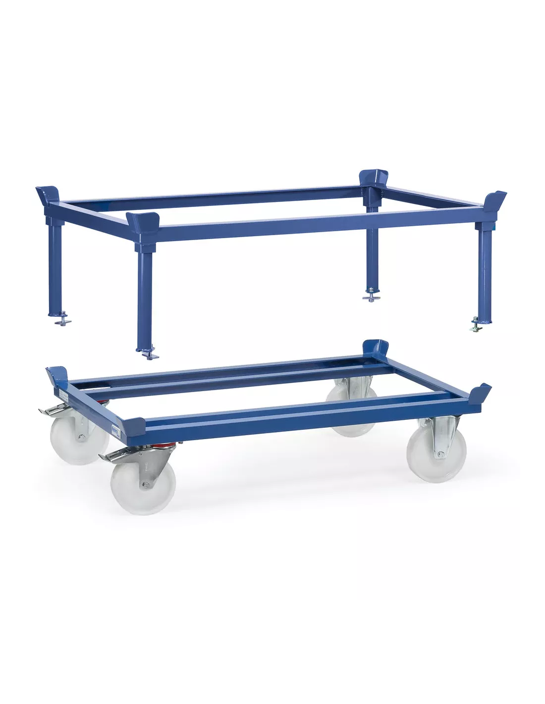 Pour placer les palettes bois ou grillagées à hauteur idéale. Construction mécano-soudée en profilé d'acier, revêtement époxy RAL 5007. 2 roues fixes et 2 roues pivotantes à bandage TPE, moyeu à roulement à billes. Freins sur roues pivotantes. Déplacement peu bruyant sur sols plats, bandage non traçant. Avec 4 supports. Barres de soutien avec pattes de renfort. Les supports peuvent être fixées au rouleur au moyen d'un système de vissage sur pattes très solide.
